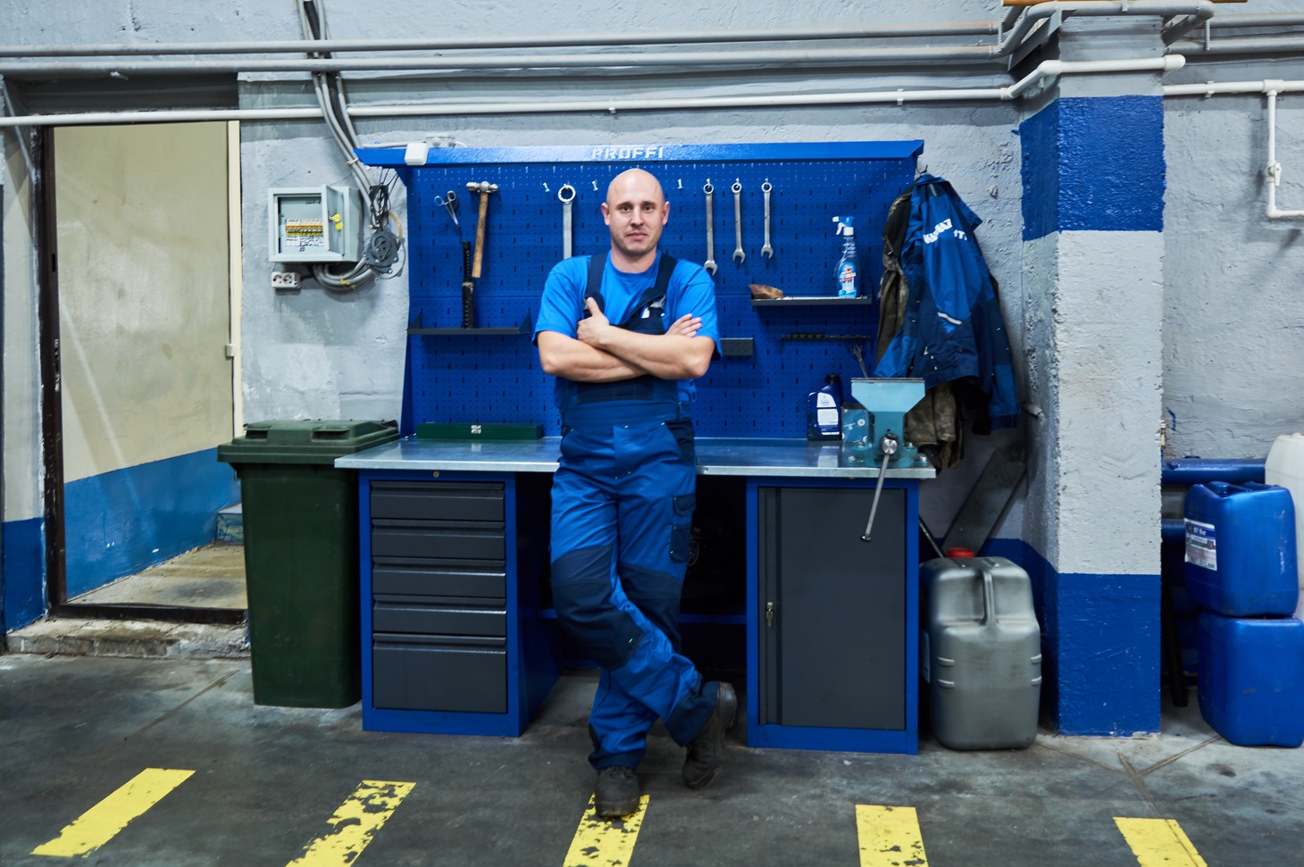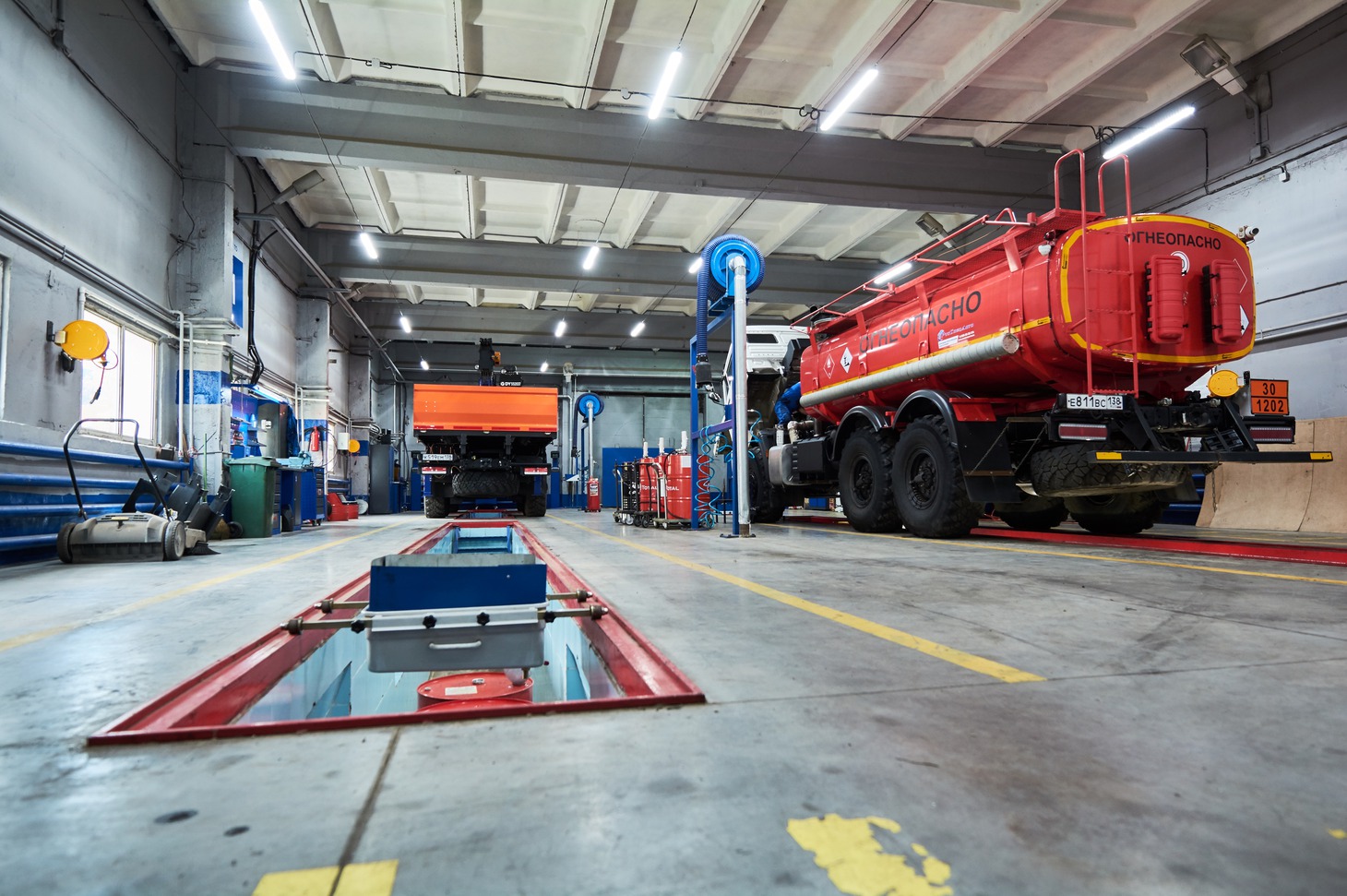 В цехе установлено моющее оборудование для очистки деталей автомобиля. В работе используются подъемники. Под потолком расположена кран-балка, с её помощью снимают двигатели, коробки передач и даже кабины машин.