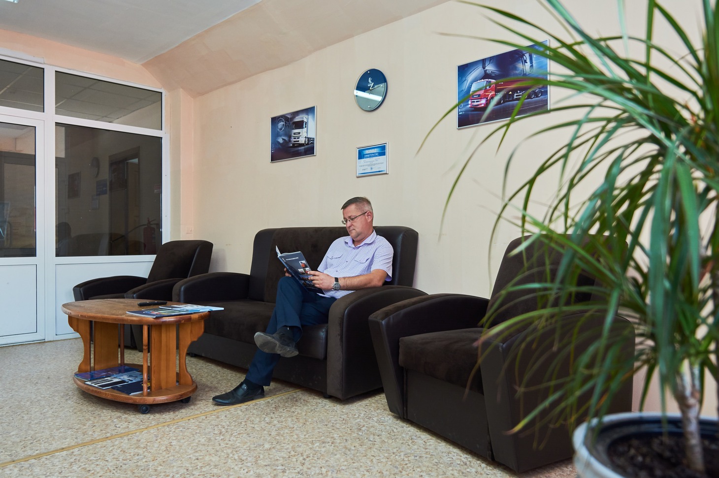 В офисе водителя большегруза встречает мастер-приемщик, который осматривает автомобиль. Его задача выявить неисправность и принять решение о дальнейшем ремонте.