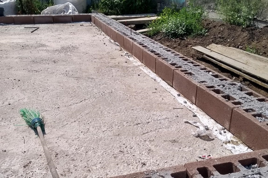 4 июля приступили к возведению стен. «Фабрика Бетонов» доставила нам керраблоки и клей. Строительная бригада выполнила работы за 18 дней, на сейсмопояс ушло 2 дня. В конце июля коробка была готова. Решили крышу делать сами. За август глава семьи в одиночку построил всю стропильную систему, закрыл крышу профлистом.