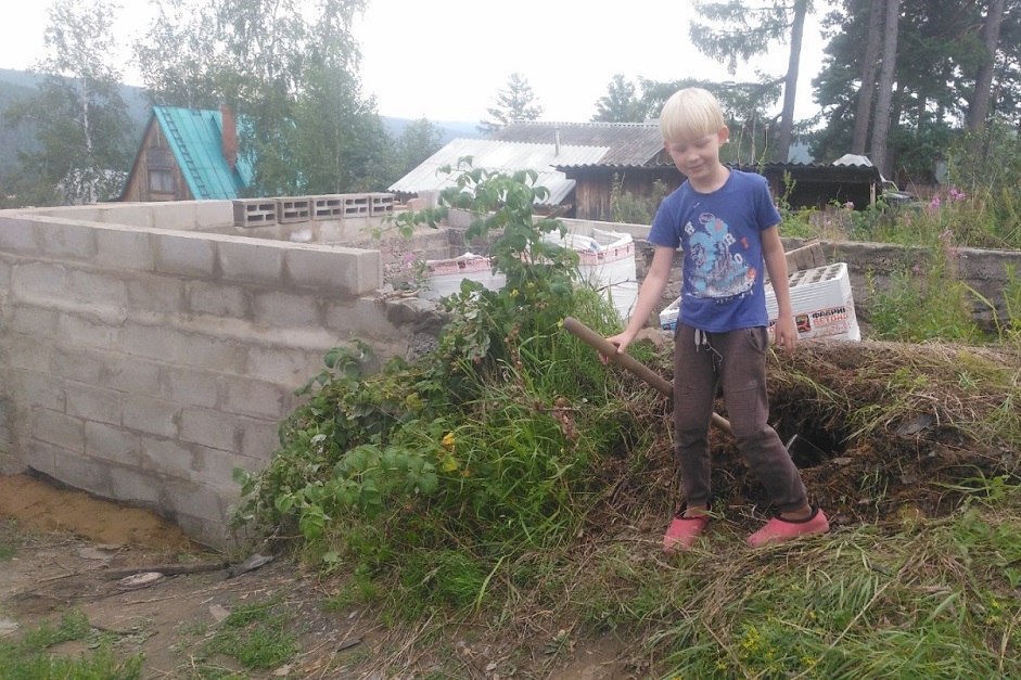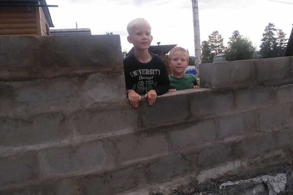 С раствором не стал мудрить, делал на глаз, что бы цвет был больше серым, чем желтым от песка. Спасибо «Фабрики Бетонов» за подаренные мешки с цементом. Но самое главное в моем строительстве – это два помощника, одному 5 лет, другому 7. Вот один из них помогает откапывать фундамент.