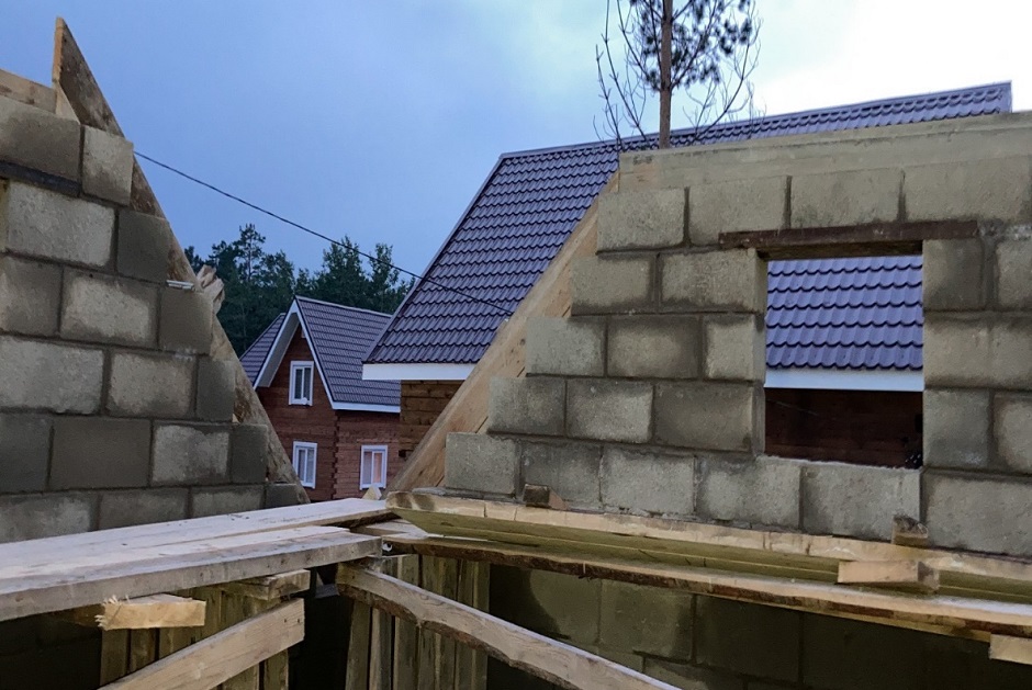 7. Возведение стен второго этажа тем же пескоблоком. Подготовка опалубки для сейсмопояса на 2 этаже здания.