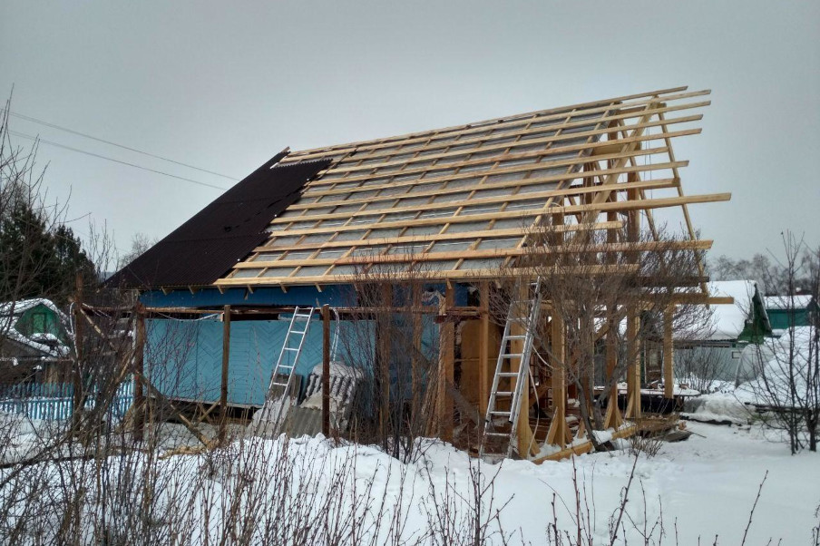Мы самостоятельно утеплили новые стены эковатой, покрыли ондулином крышу. Вот как раз фото этого момента.