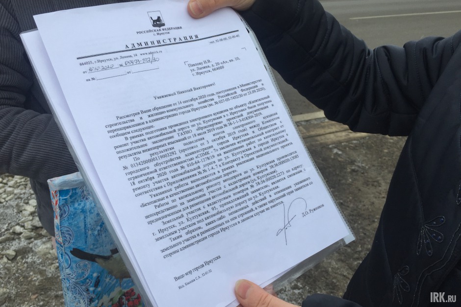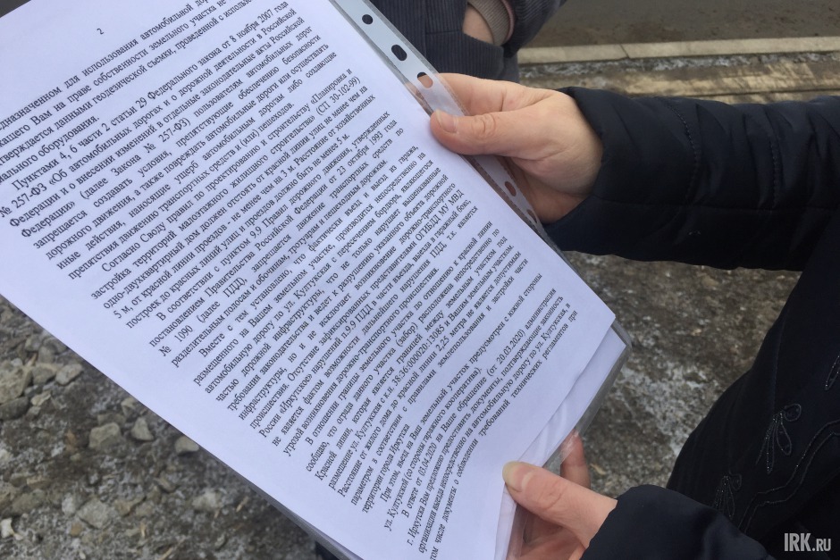 В ответе, который она получила от 3 марта 2020 года, за подписью и. о. заместителя председателя комитета — начальника департамента дорожной деятельности и транспорта комитета городского обустройства администрации Иркутска И.А. Седуновой говорится, что «часть гаража попадает на территорию общего пользования, а выезд из гаражного бокса осуществляется непосредственно на автомобильную дорогу местного значения без организации примыкания к автомобильной дороге, что, в свою очередь, не обеспечивает безопасность дорожного движения, в связи с чем просим вас предоставить документы, подтверждающие законность организации выезда непосредственно на ул. Култукская, в том числе документы, подтверждающие соблюдение требований технических регламентов при возведении указанного гаражного бокса».