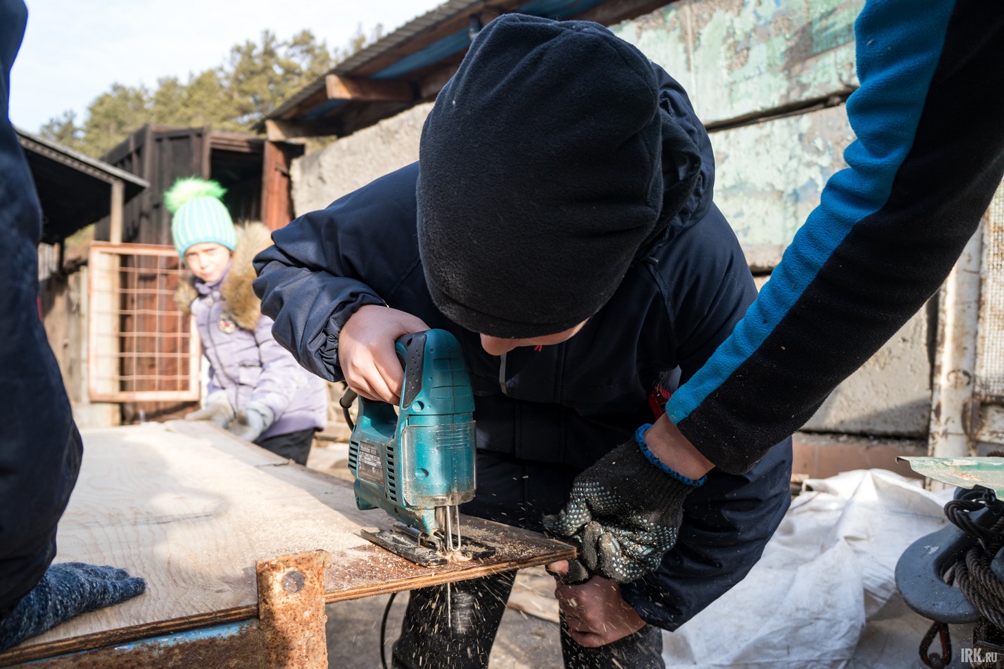Марина приехала с сыновьями — школьниками Сашей и Женей. По радио в машине услышали, что питомнику нужна помощь. Семья тоже из Ангарска, но здесь не первый раз. Половину инструментов привезли с собой, половину им дали на месте.