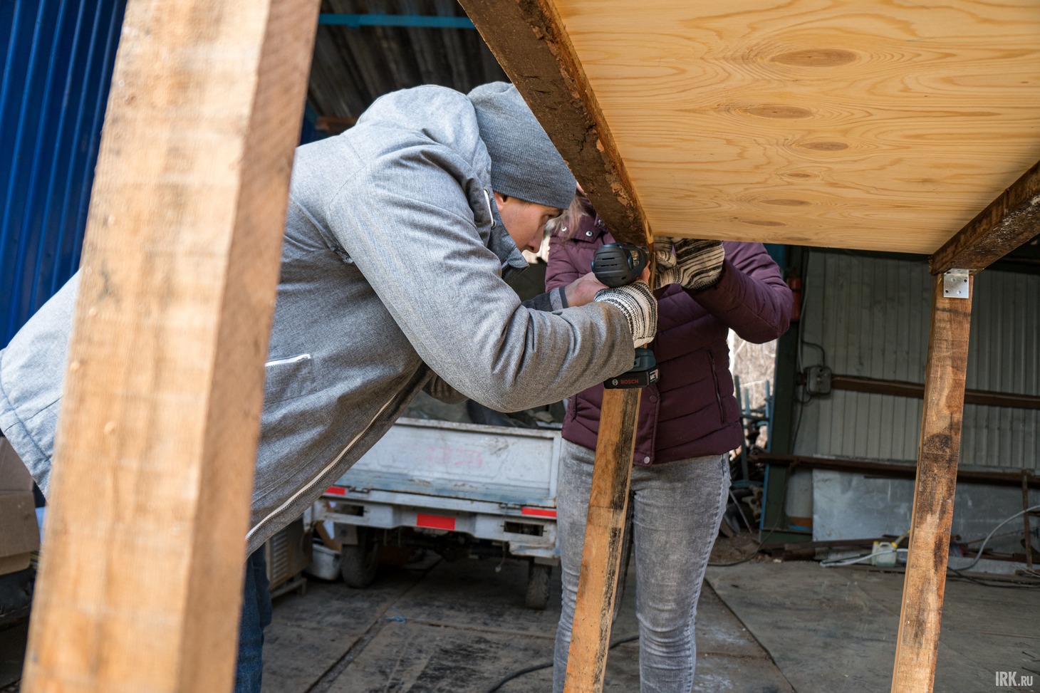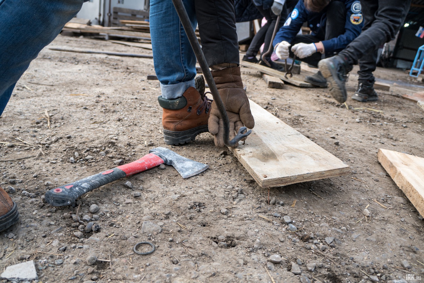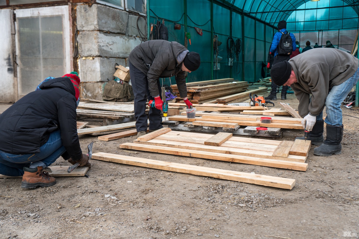 Бойцы студенческих отрядов ИРНИТУ тоже присоединились к строительству будок. Студент вуза Артём Спиридонов рассказал, что добровольцы взяли с собой необходимые инструменты: пилу, шуруповерт, топоры и молотки. Организаторы предоставили доски и фанеру.