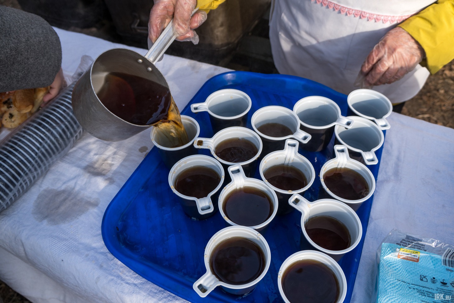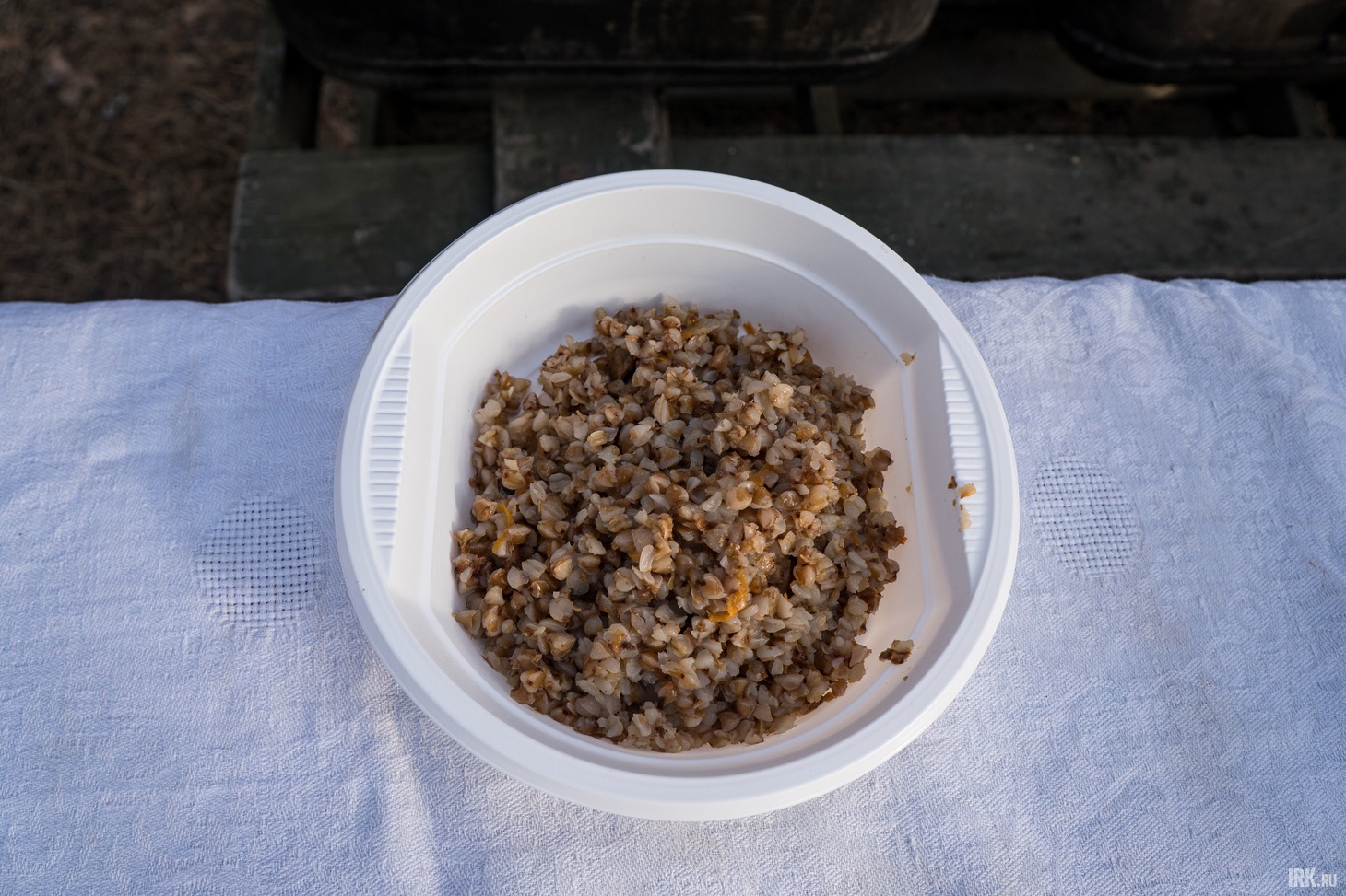 В К-9 работала полевая кухня. Волонтеры могли согреться горячим чаем и поесть гречневую кашу с тушенкой.