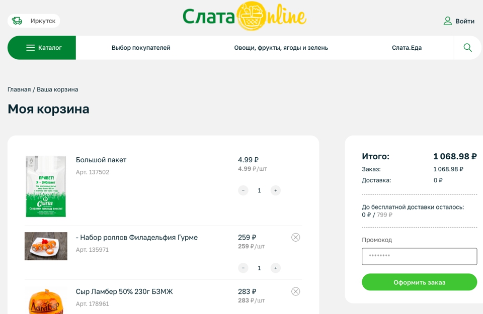 В Иркутске при заказе от 800 рублей предусмотрена бесплатная доставка, при сумме чека от 500 до 799 рублей за доставку нужно заплатить 150 рублей.