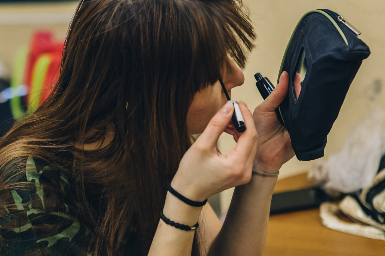 В раздевалку к хоккеистам мы не попали, зато посмотрели, как готовятся к выходу девушки из группы поддержки. Они выходят к зрителям перед матчем, а во время него находятся на трибунах.