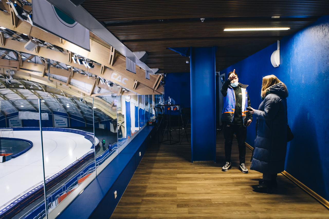 Мы еще вернемся на первый этаж, а пока идем дальше. Перемещения по ледовому дворцу — настоящий квест. Артём рассказывает, что в день матча проходит по 15 километров. С учетом лестниц и дверей, которые постоянно попадаются на пути, получается неплохая тренировка.