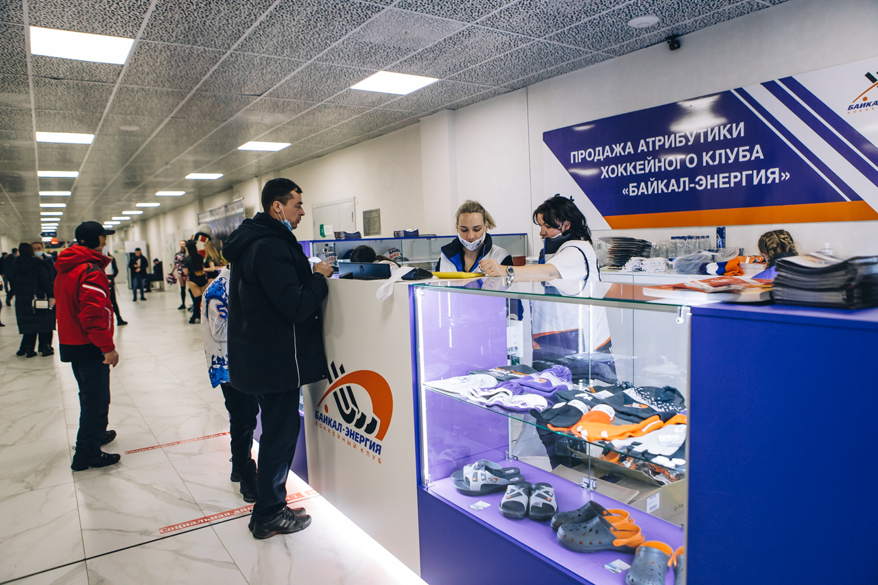 На первом этаже все уже готово к приходу болельщиков. Здесь находятся два павильона, где продают сувениры с символикой хоккейного клуба «Байкал-Энергия», и фотозона. Перед матчем и в перерывах возле них выстраиваются очереди из болельщиков. Когда наша команда побеждает, за сувенирами спешат и после окончания матча.