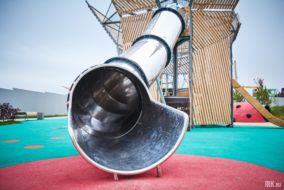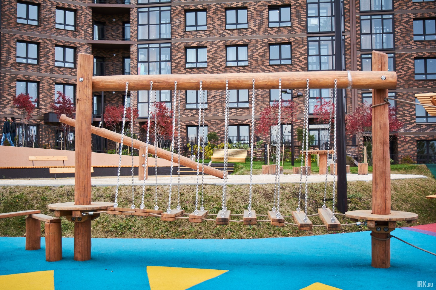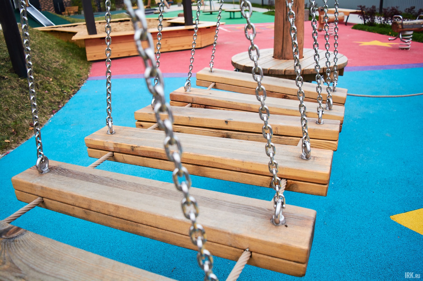 Идем к первой детской площадке, она большая и яркая. Здесь много всего, что доставит массу удовольствия детям разного возраста: батут, горки, полоса препятствий, песочница. Но главное — родителям не нужно переживать за ребятишек: вся территория площадки застелена мягким покрытием для безопасности маленьких жителей. Интересно, что основные материалы, которые использовал застройщик для детских площадок, — это дерево и другие природные материалы, металл практически нет.