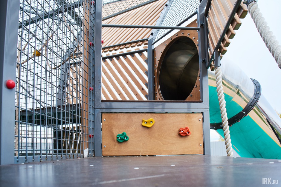 На второй площадке установлен большой игровой комплекс для лазания с горками, напоминающий космический корабль. В нем много разных игровых элементов, я не рискнула их опробовать, но уверена, что дети от него в восторге.