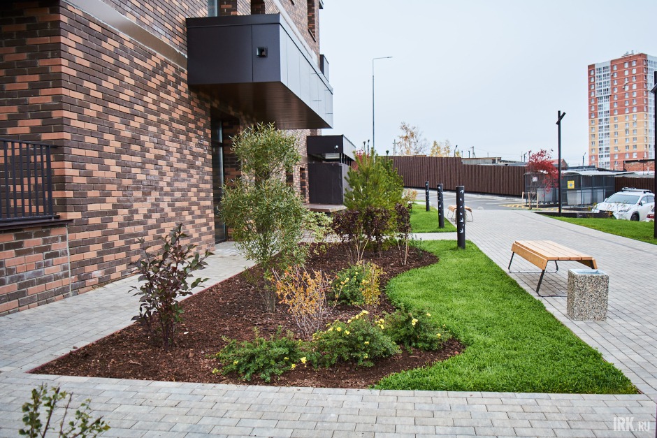 Отдельно хочу отметить озеленение территории жилого комплекса. Деревья, кустарники и цветочные клумбы посажены вокруг всех детских площадок, а также вдоль дома со стороны улицы Центральной и внутреннего двора. Позаботились и о зимней зелени: в комплексе высажено много хвойных деревьев. Надеюсь, и через несколько лет здесь будет также красиво — хотя это уже на совести будущих жильцов и управляющей компании.