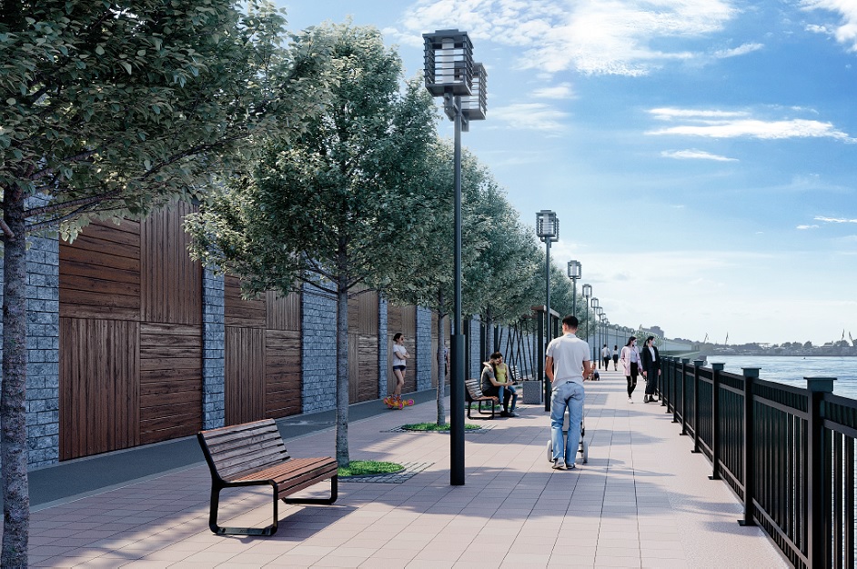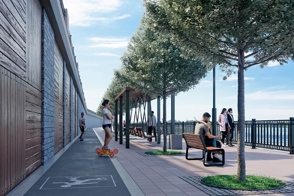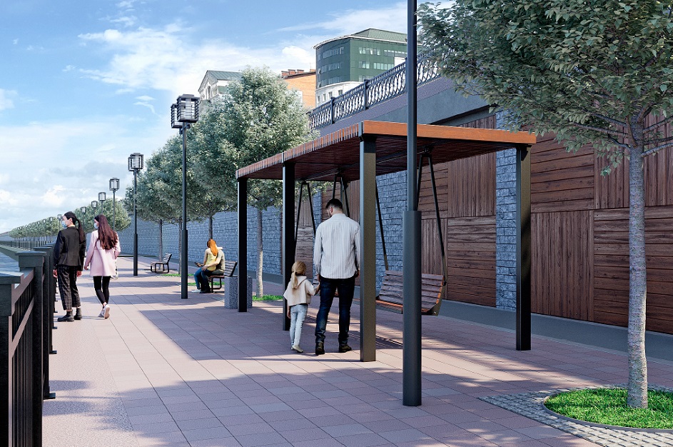 Работы на нижнем ярусе пройдут в 2022 году. Здесь тоже заменят фонари, посередине променада поставят перголы с качелями, скамейки и урны. Выделят отдельную линию для активных видов спорта, где можно будет кататься на роликах, самокатах и велосипедах.