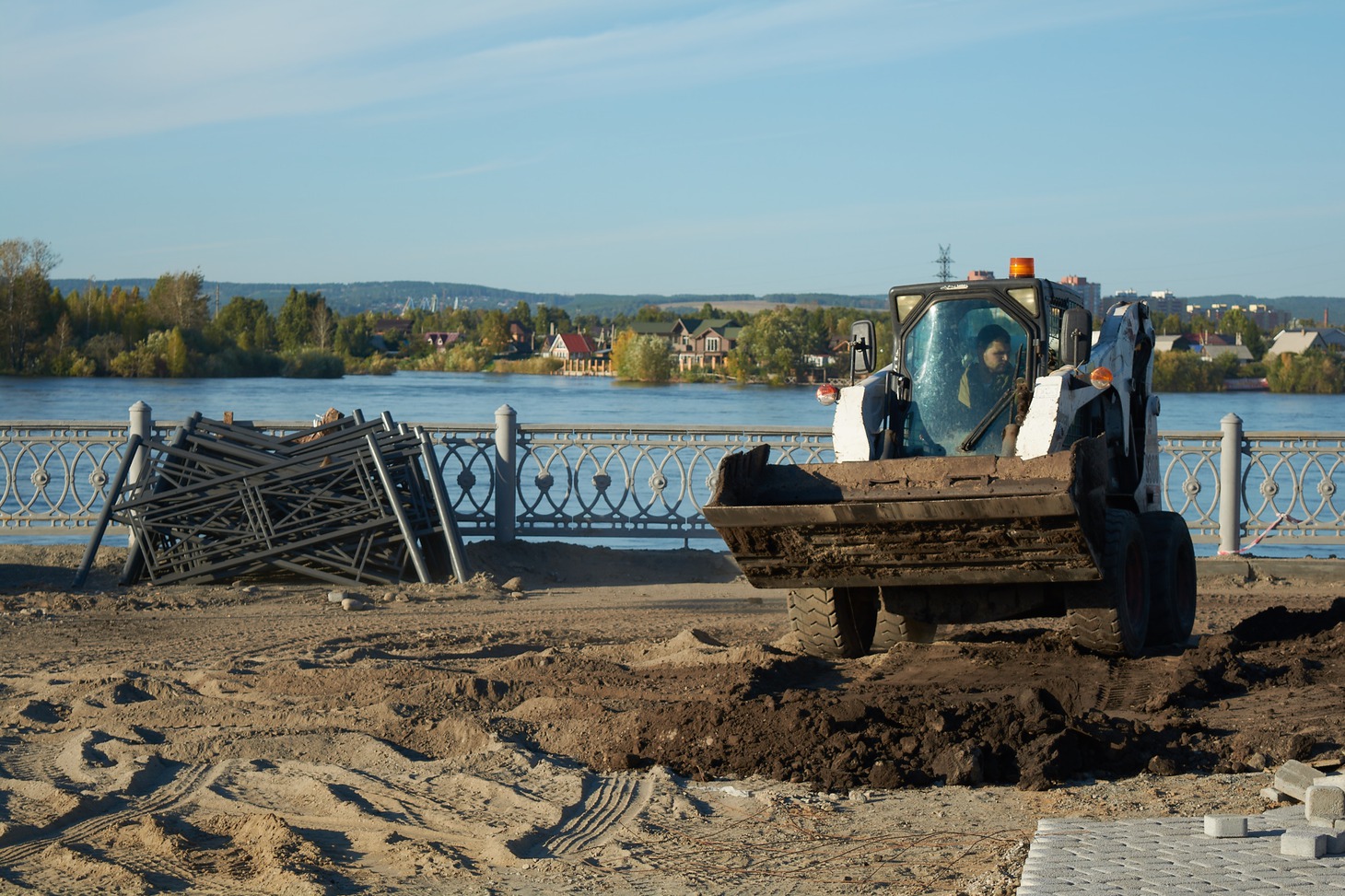 Пока горожане неспешно прогуливаются в нижнем ярусе набережной, наверху развернулась настоящая строительная площадка. На участке от котельной «Кировская» до памятника Якову Похабову укладывают плитку и готовят газоны для посадки кустарников.