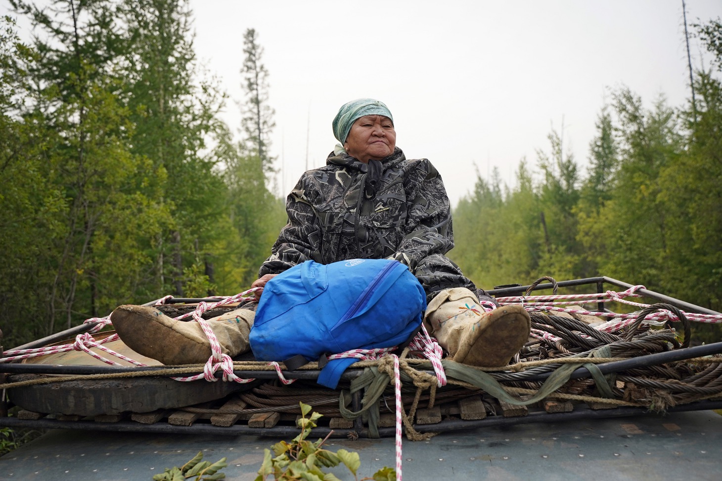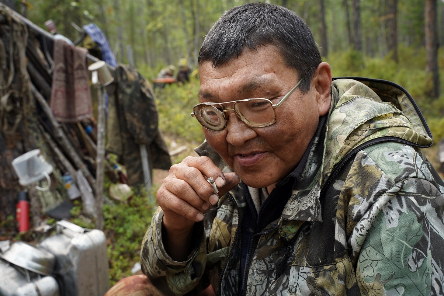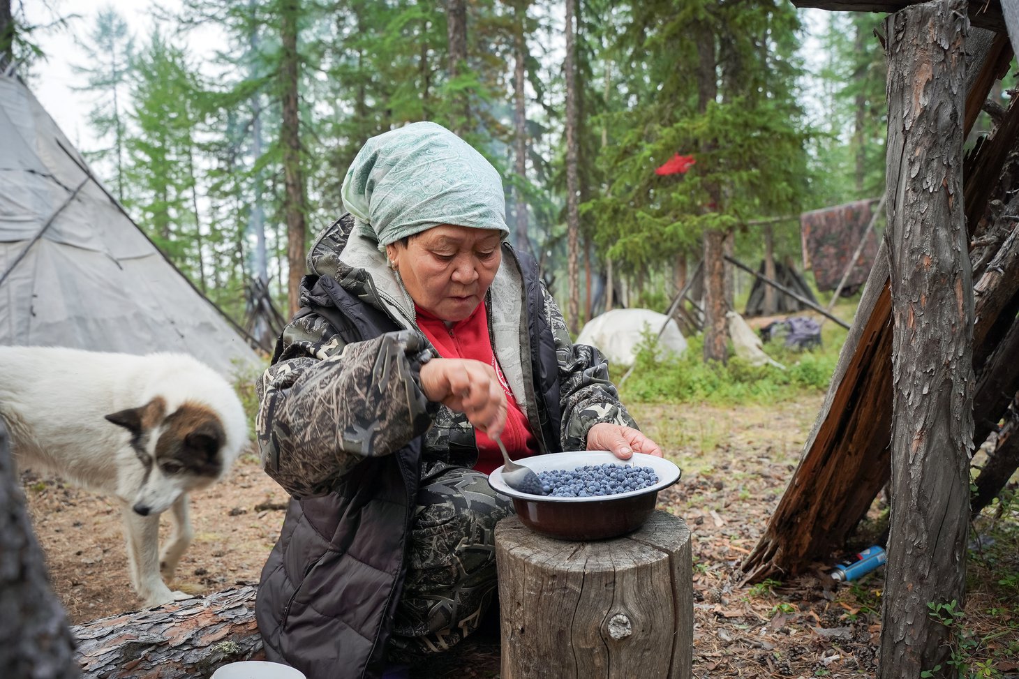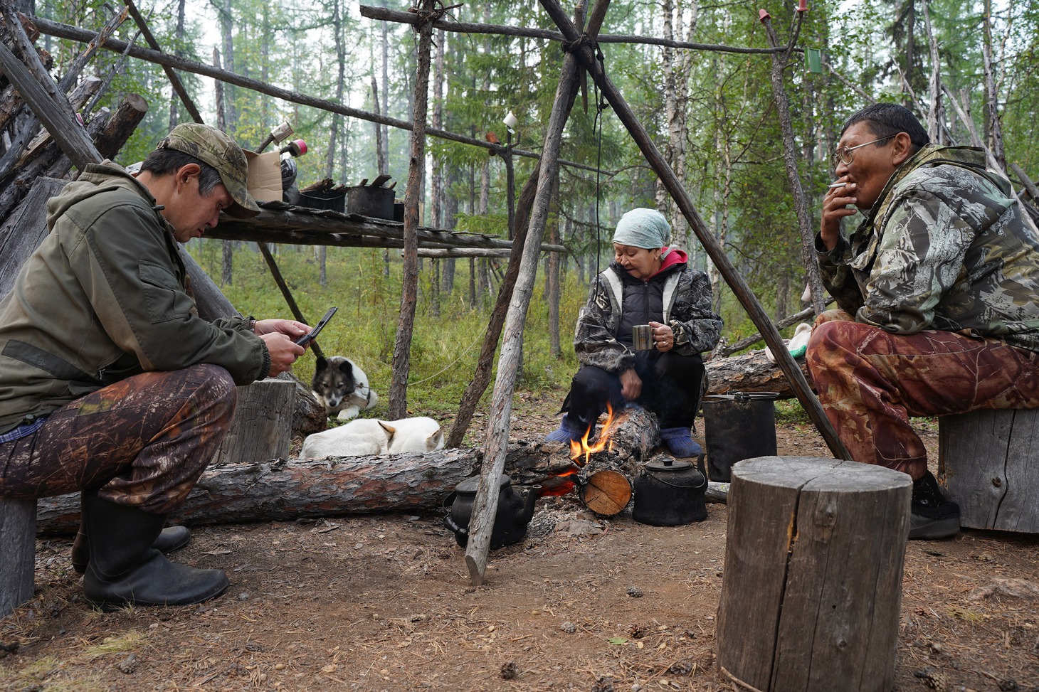 Крыша вездехода, как выяснилось, излюбленное место 70-летней пенсионерки, потому что в кузове машины угарно и все время укачивает. Наш броневик расталкивал, гнул, ломал зелень, успевшую оккупировать геопрофиль, со стороны это скорее походило на то, как машина пытается раздвинуть зеленый занавес, казалось, вот-вот расступятся молодые березы и появится стойбище, но оно не появилось ни через час, ни через два, ни через пять. Лишь поздним вечером дорога привела нас к стоянке Виктора Сычёгира. Вместе с женой Светланой много лет они живут на берегу обмелевшего Дагылгана. Проблемы со зрением не позволяют Виктору держать оленей, и он занимается в основном рыбалкой и охотой. С Большой земли эвенкам привезли продукты и необходимые вещи, самые востребованные из которых – дождевые плащи и налобные фонарики. Однако выгрузку посылок решили перенести на утро.