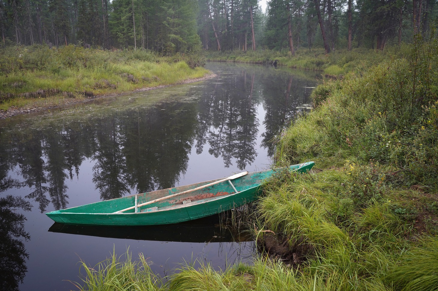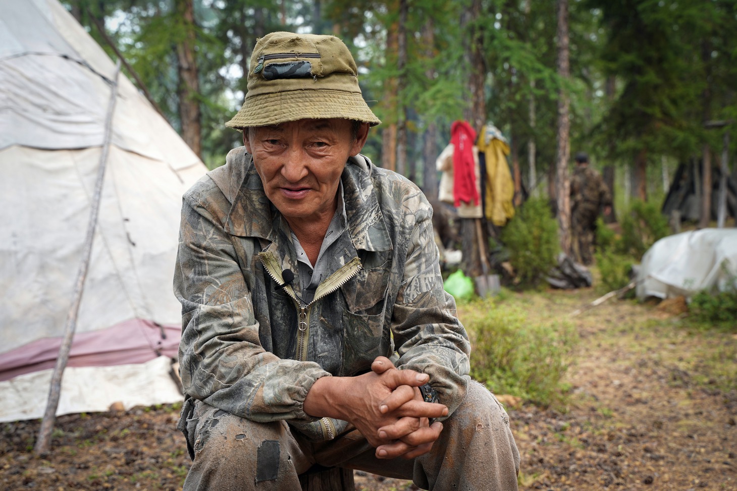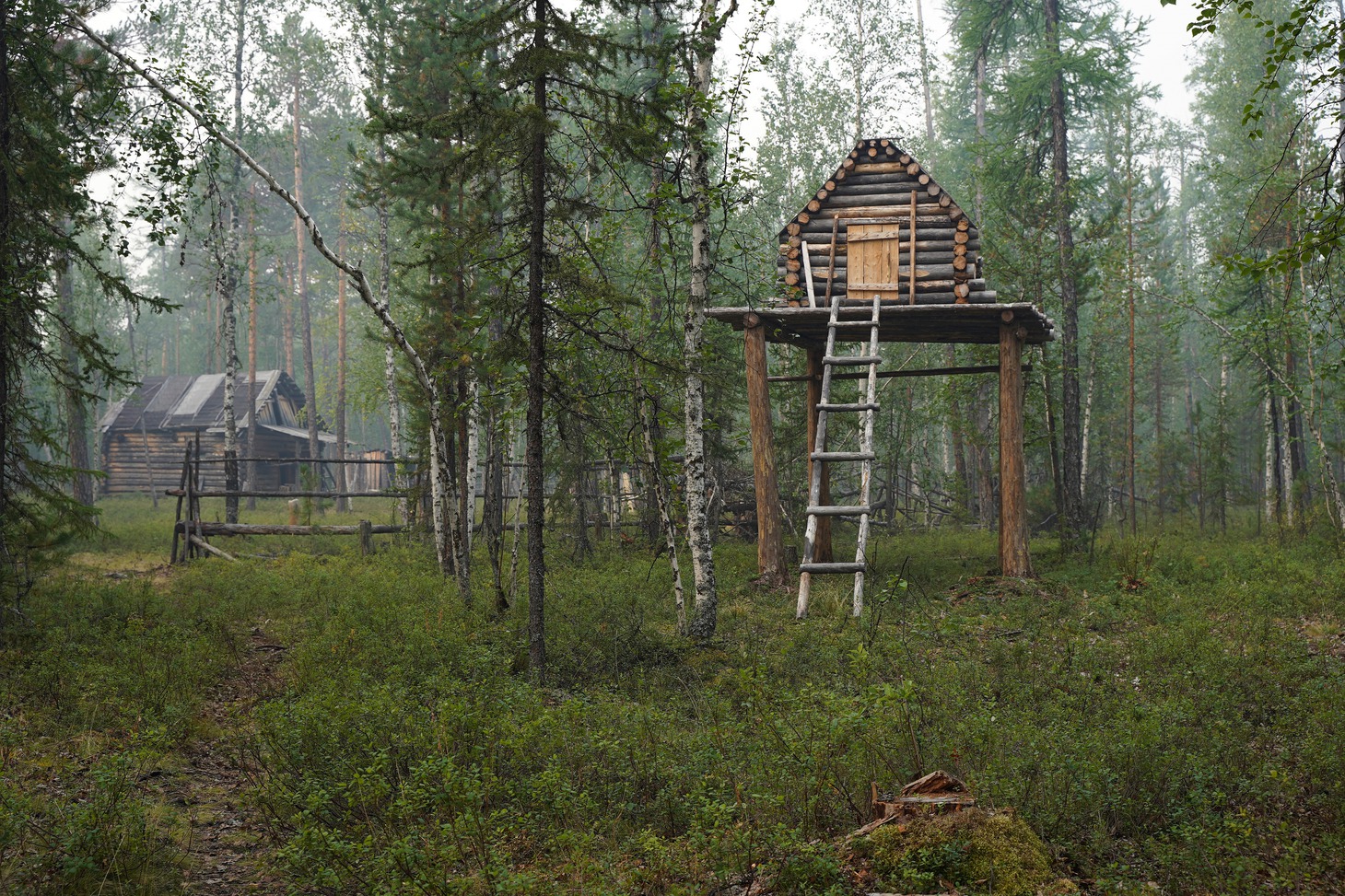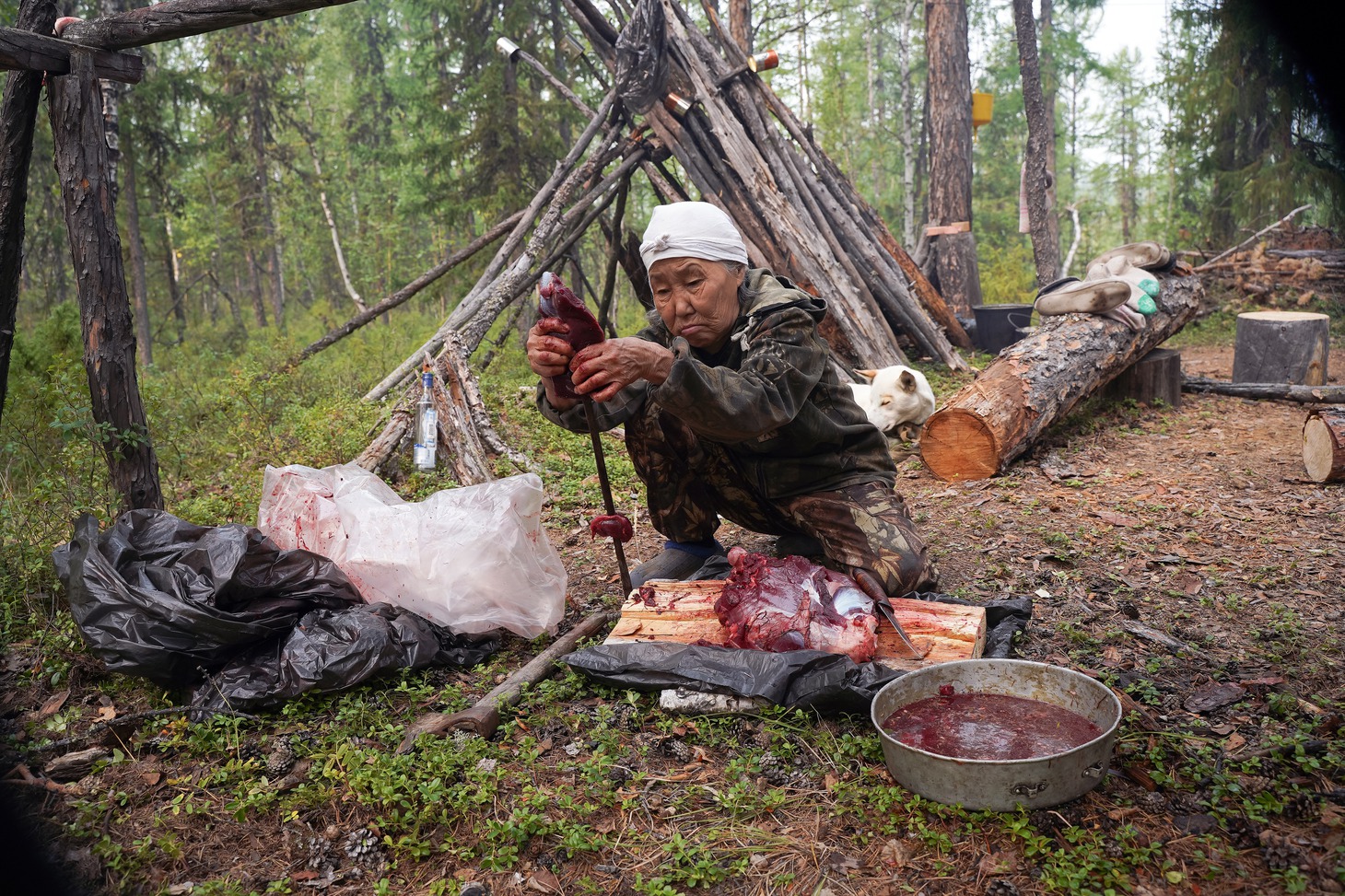 Крыша вездехода, как выяснилось, излюбленное место 70-летней пенсионерки, потому что в кузове машины угарно и все время укачивает. Наш броневик расталкивал, гнул, ломал зелень, успевшую оккупировать геопрофиль, со стороны это скорее походило на то, как машина пытается раздвинуть зеленый занавес, казалось, вот-вот расступятся молодые березы и появится стойбище, но оно не появилось ни через час, ни через два, ни через пять. Лишь поздним вечером дорога привела нас к стоянке Виктора Сычёгира. Вместе с женой Светланой много лет они живут на берегу обмелевшего Дагылгана. Проблемы со зрением не позволяют Виктору держать оленей, и он занимается в основном рыбалкой и охотой. С Большой земли эвенкам привезли продукты и необходимые вещи, самые востребованные из которых – дождевые плащи и налобные фонарики. Однако выгрузку посылок решили перенести на утро.