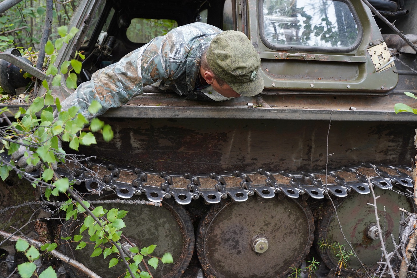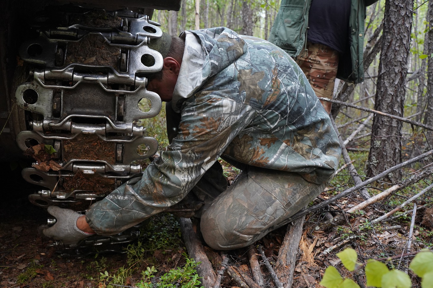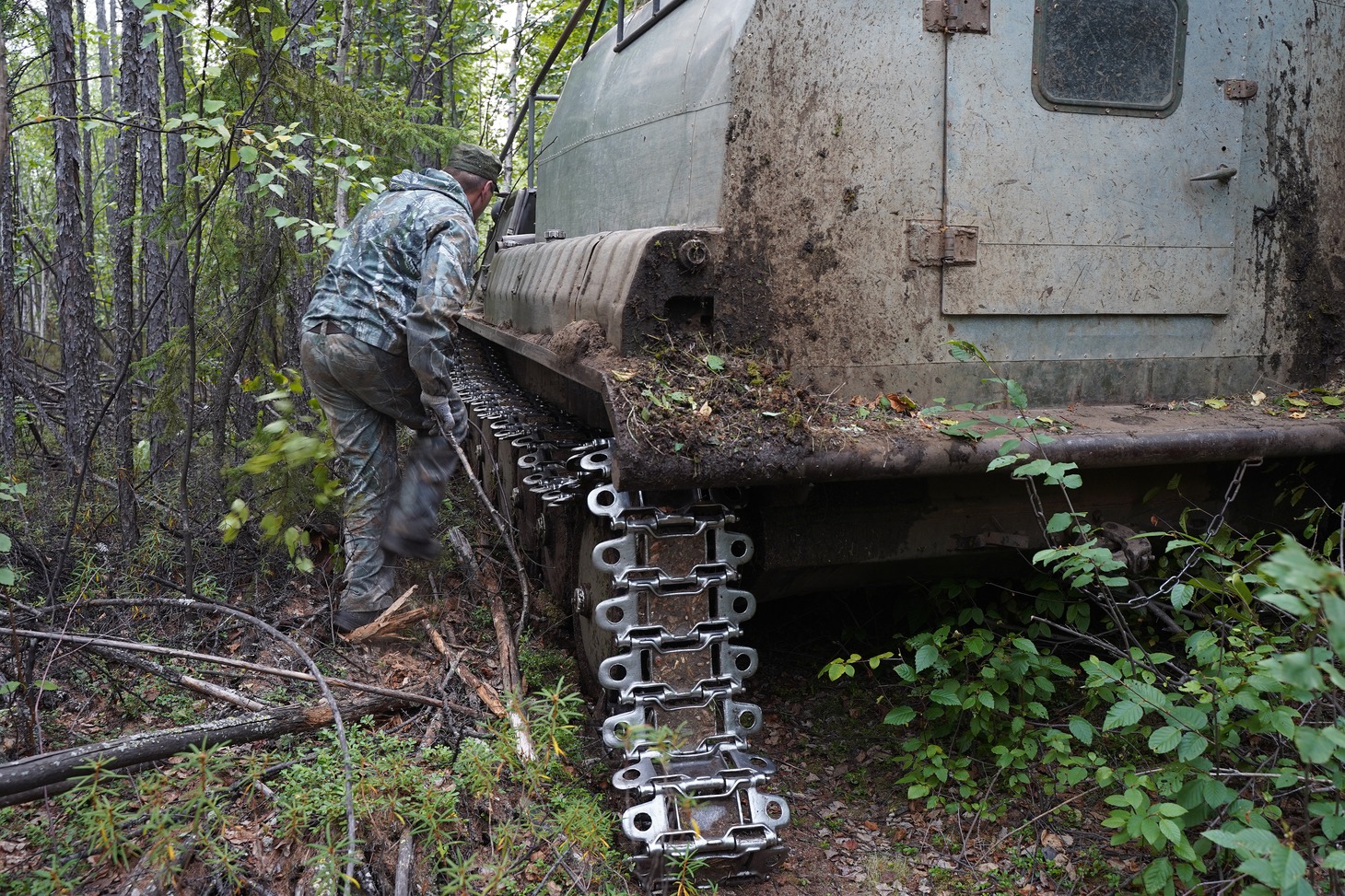В механизированной помощи в поселке отказали – тягач находился где-то далеко, а группа находилась в самом начале пути. В сложившейся ситуации мы целиком и полностью полагались на опыт и чутье водителя, ну и на удачу, конечно, куда же без неё в лесу. И удача, как нельзя кстати, оказалась на нашей стороне. Провалившийся в трясину вездеход смог выбраться самостоятельно с первой попытки, чему не меньше нашего удивился водитель. Правда, бонусом к провалу слетела гусеница, но её сообща довольно быстро вернули на место.