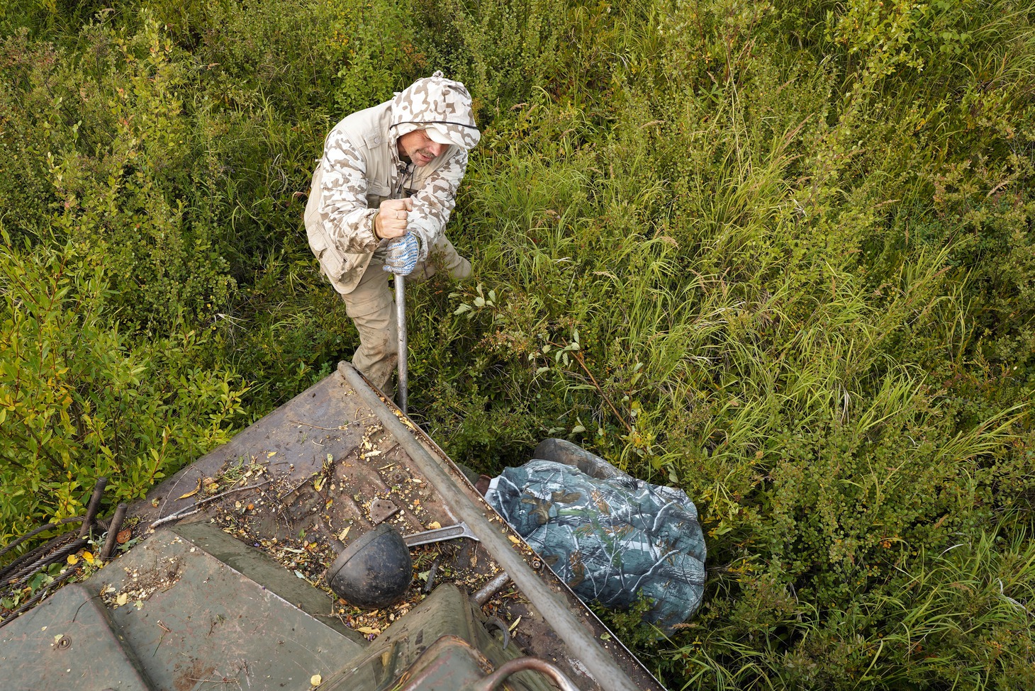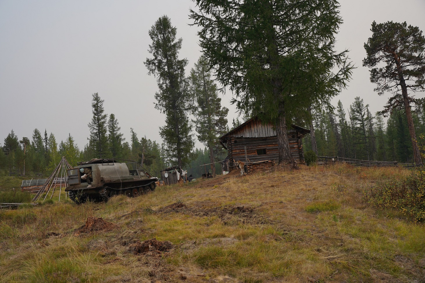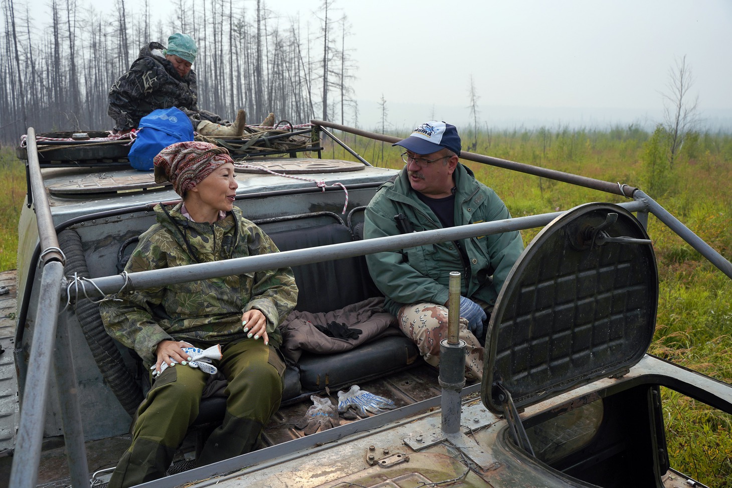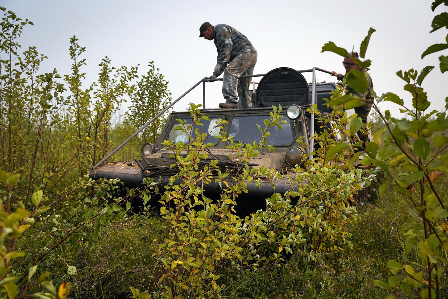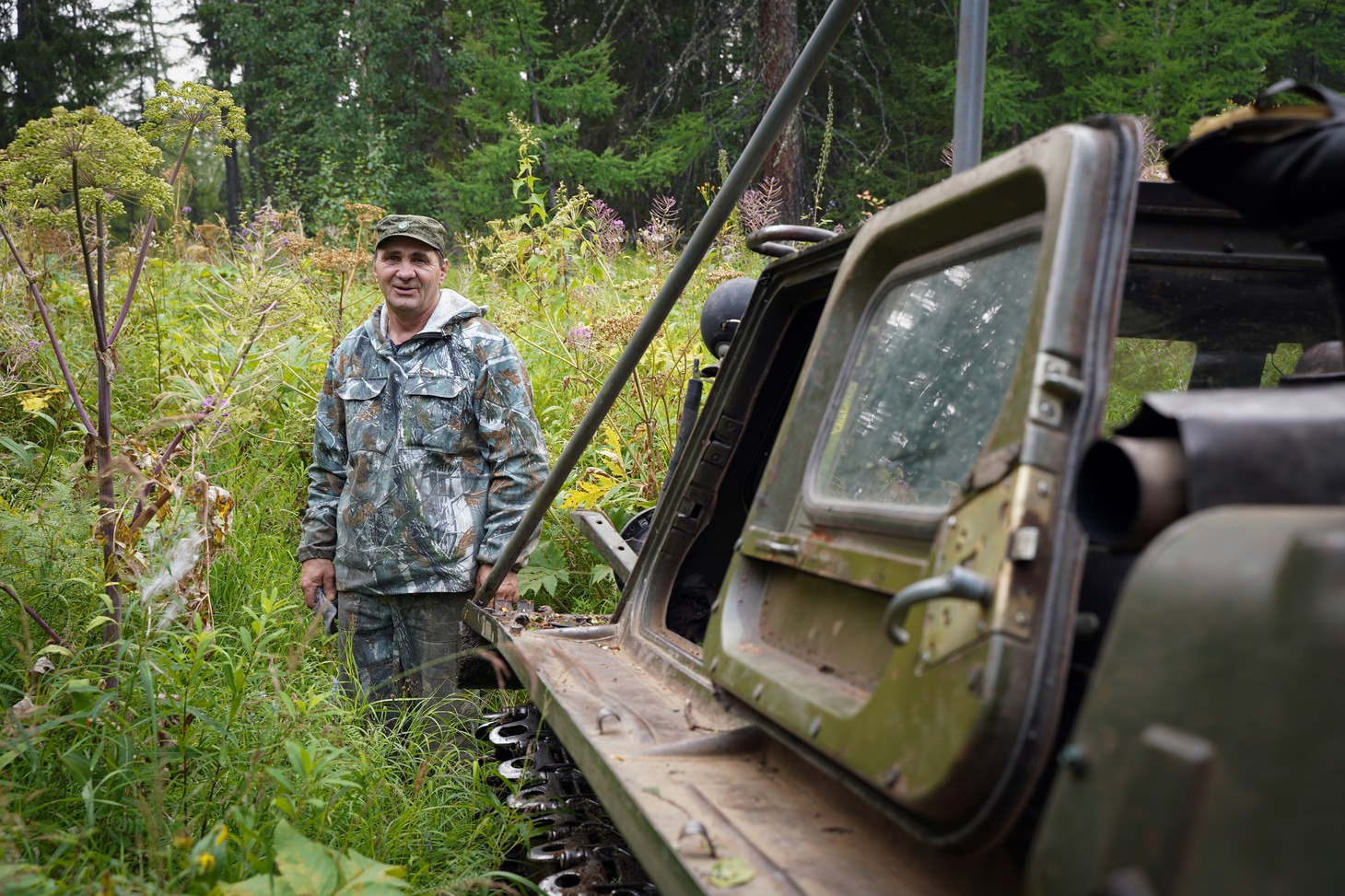 Несколько часов дорога шла по просекам, или геопрофилям сейсморазведки, которые делят тайгу на ровные квадраты. Со временем просеки изрядно заросли молодой порослью и дорога уже едва угадывается. Лязг гусениц пугал выводки глухарей, зайцев, которые, повинуясь инстинкту, пытались скрыться, но по неопытности бежали впереди вездехода и только потом резко ныряли в чащу. По краю профиля еще с прошлого охотничьего сезона висели банки и болтались на проволоке закрытые капканы. Промысел соболя начнется не раньше ноября. Даже пасторальная картина не давала расслабиться ни на секунду, приходилось всё время следить за нависающими над просекой ветками: чуть проморгал и тут же получаешь горячую бодрящую пощечину. Периодически мы оглядывались – на самом верху вездехода, держась за веревки, словно за поводья, сидела Ия Ивановна Цуркан.