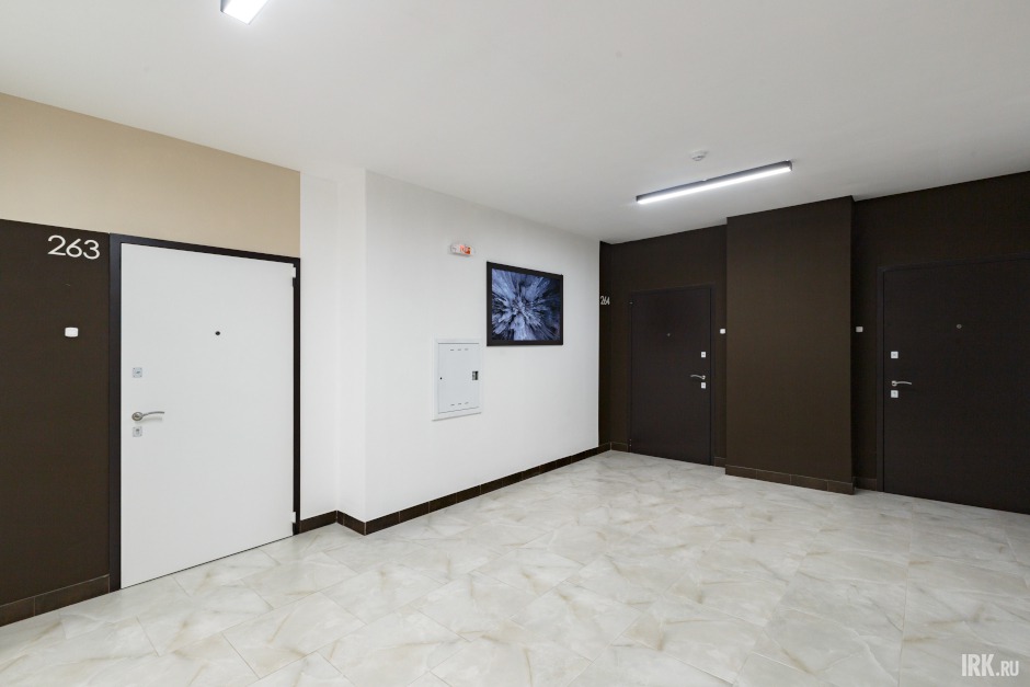 На этаже по 11 квартир. Очень понравились входные двери, выполненные в темных и светлых тонах. Они органично вписываются в концепцию общественного пространства. Как правило, жильцам новостроек приходится менять двери, поскольку некоторые застройщики часто экономят и устанавливают дешевые. Здесь другая история: застройщик установил качественные, надежные и стильные двери.
