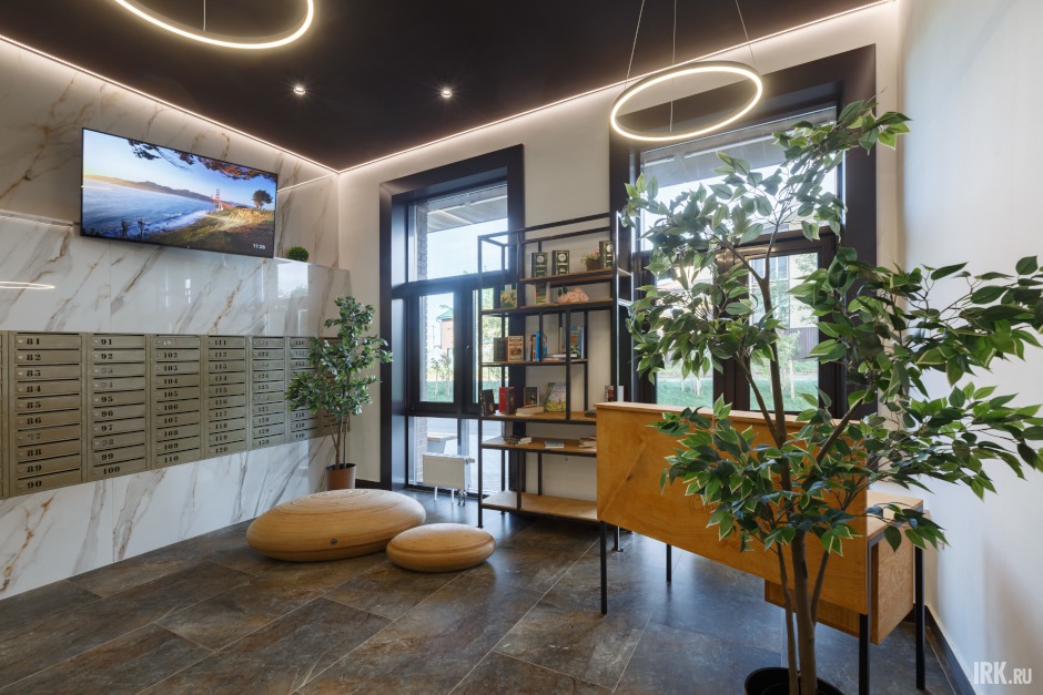 В дизайне помещений застройщик использовал надежные и простые материалы — керамогранит и натуральное дерево. Кстати, здесь даже почтовые ящики служат элементом интерьера входной группы. Изюминка этого помещения — панорамное остекление, благодаря которому в лобби много света, а искусственное освещение позволяет правильно расставить акценты в интерьере, когда за окном темно.