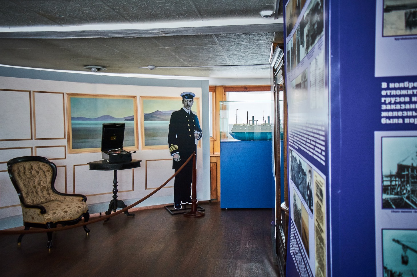 Главная на сегодняшний день экспозиция «Ангары» размещена в кают-компании. Там множество фотографий, документов и предметов быта команд за всю историю судна. Визуально самое эффектное место ледокола — фотозона со старинным роялем и креслом, очень похожим на те, что фигурировали в кинофильме «12 стульев». По словам Ивана Беспалова, кают-компания в начале 20 века была очень стильным помещением по моде того времени, ведь проезд на ледоколе могли себе позволить только довольно состоятельные люди. Пока отделку, идентичную тому времени восстановить не удалось. Но она есть на фотографиях, так что каждый сможет представить, какой богатый интерьер был здесь когда-то.