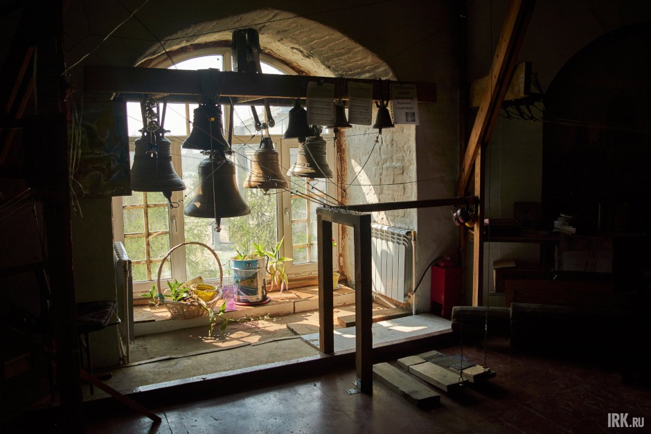 Иркутск в 18-19 веках славился лучшими мастерами колокольного литья. Из всей коллекции колоколов, с сожалением рассказывает звонарь, до нашего времени сохранился только один небольшой колокол, отлитый в городе еще в 1881 году, который и сейчас висит здесь. Остальные были уничтожены, в том числе и самый большой колокол в Сибири весом в 21 тонну; он был изготовлен в нашем городе специально для Вознесенского монастыря. А сейчас вес самого большого колокола в Иркутске всего 4,5 тонны – его отлили в Ярославле.