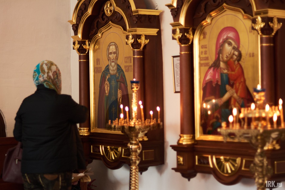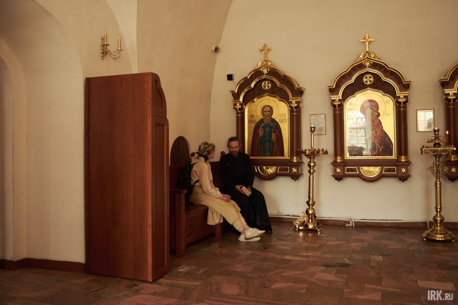 В следующем зале перед иконами стоят подсвечники, на которые прихожане ставят свечи о здравии и об упокоении. Зажечь свечу за здравие можно, например, перед Божией Матерью или ликом святого, который исцеляет, а вот за умерших — только перед одной иконой, посвященной блаженной Марфе. Справа и слева от входа стоят деревянные лавки для отдыха или беседы с батюшкой. Тут же на крючках висят платки для тех, кто их забыл: ведь при входе в православный храм мужчины должны снять головные уборы, женщины, напротив, — покрыть голову.