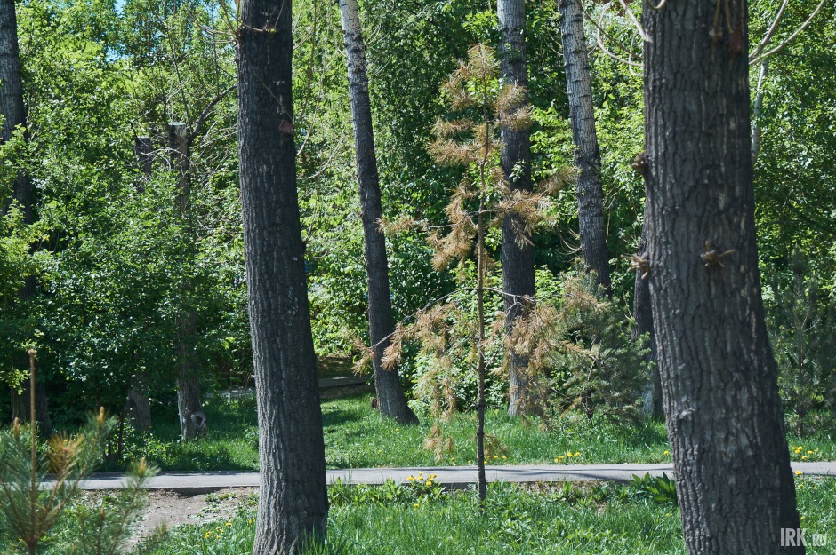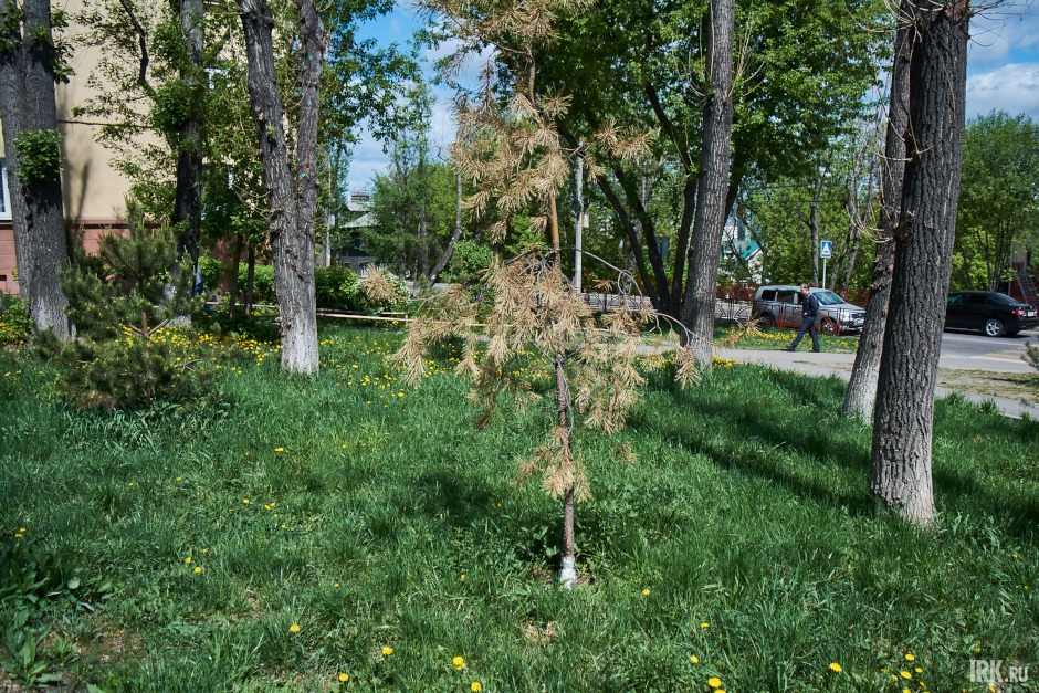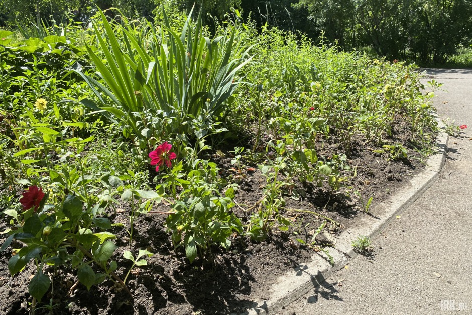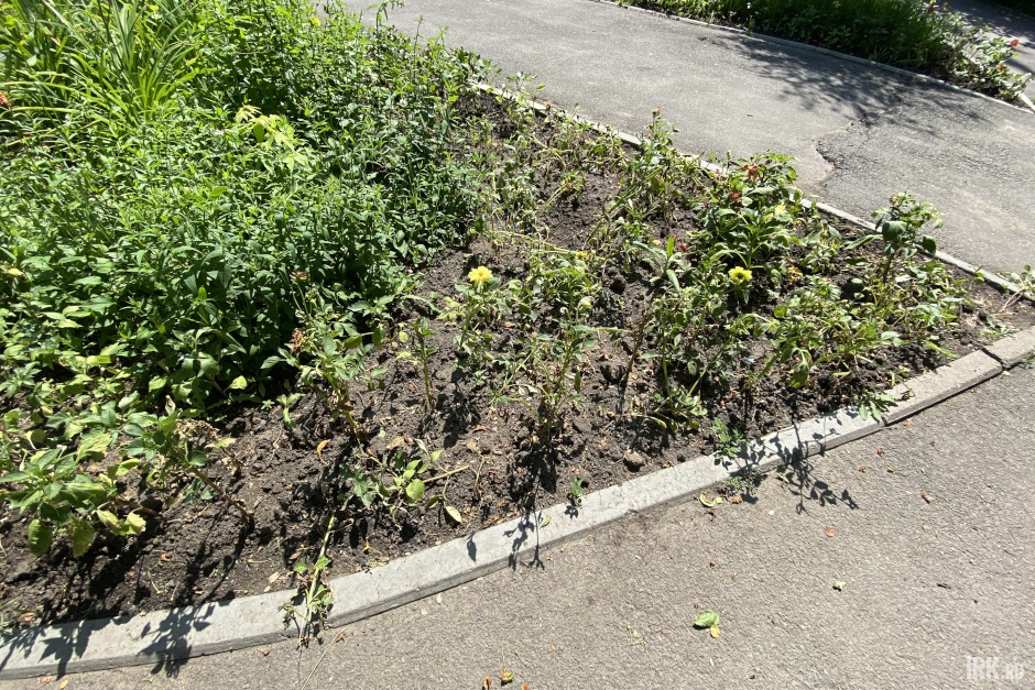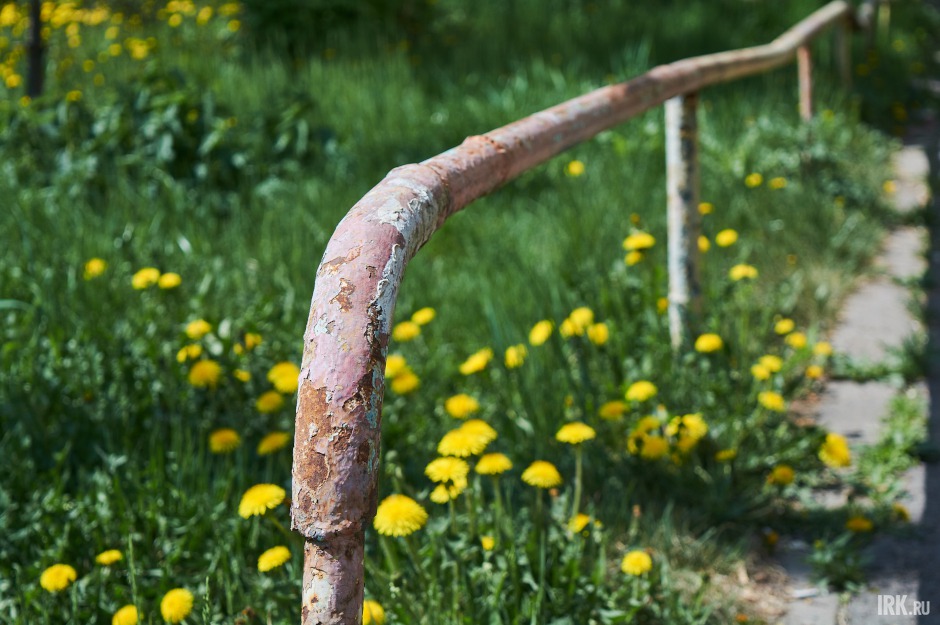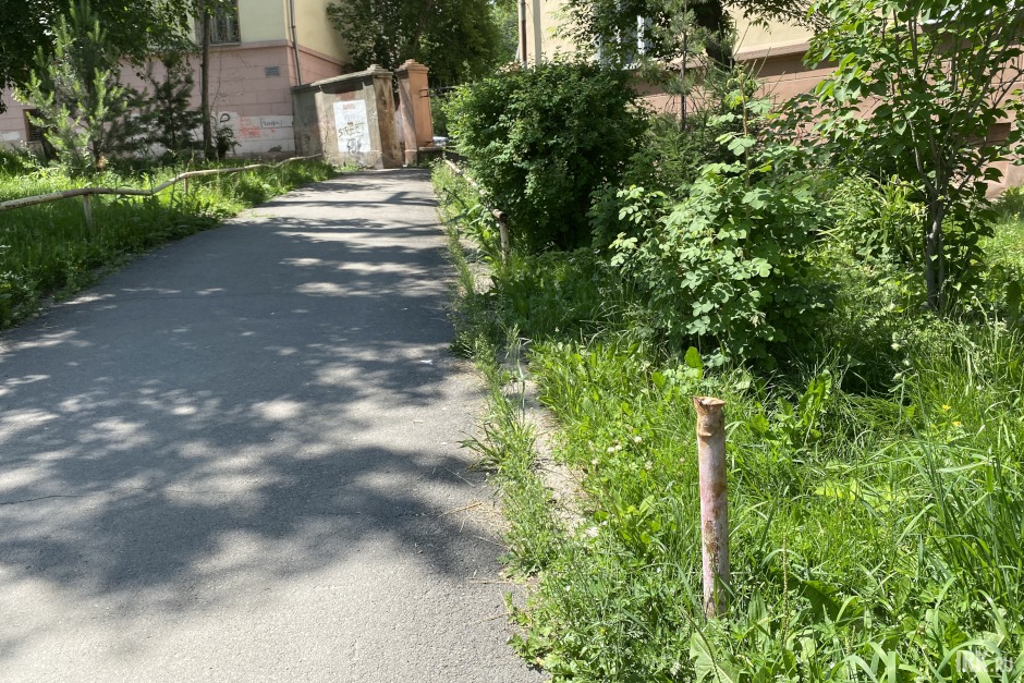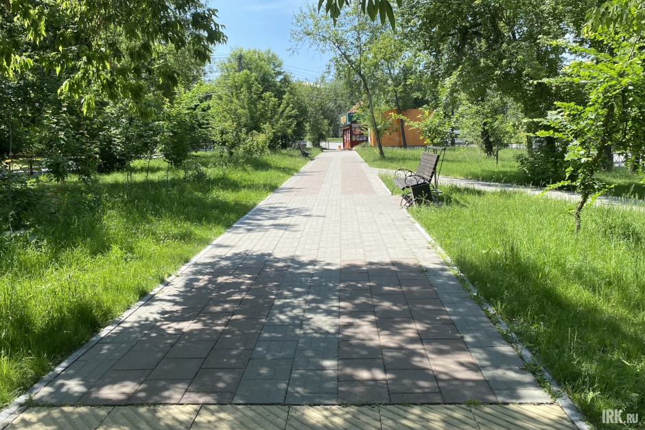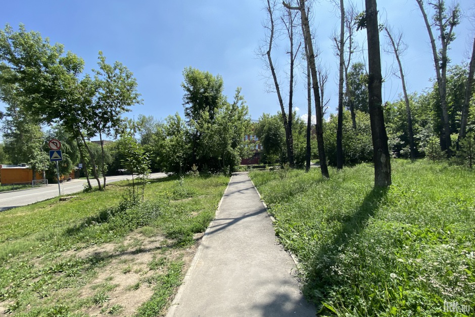 Посередине сквера разбили клумбу и засадили ее цветами, часть которых уже отцвела, часть пожелтела и пожухла на жаре. Несколько молодых елей не прижились и высохли, их, кстати, убрали буквально через несколько дней после того, как мы побывали здесь. Вдоль одного из тротуаров еще с советских времен остались поручни — они ржавые и сломанные, — но вот почему-то их до сих пор не демонтировали, даже после благоустройства этого пространства оставили как есть.