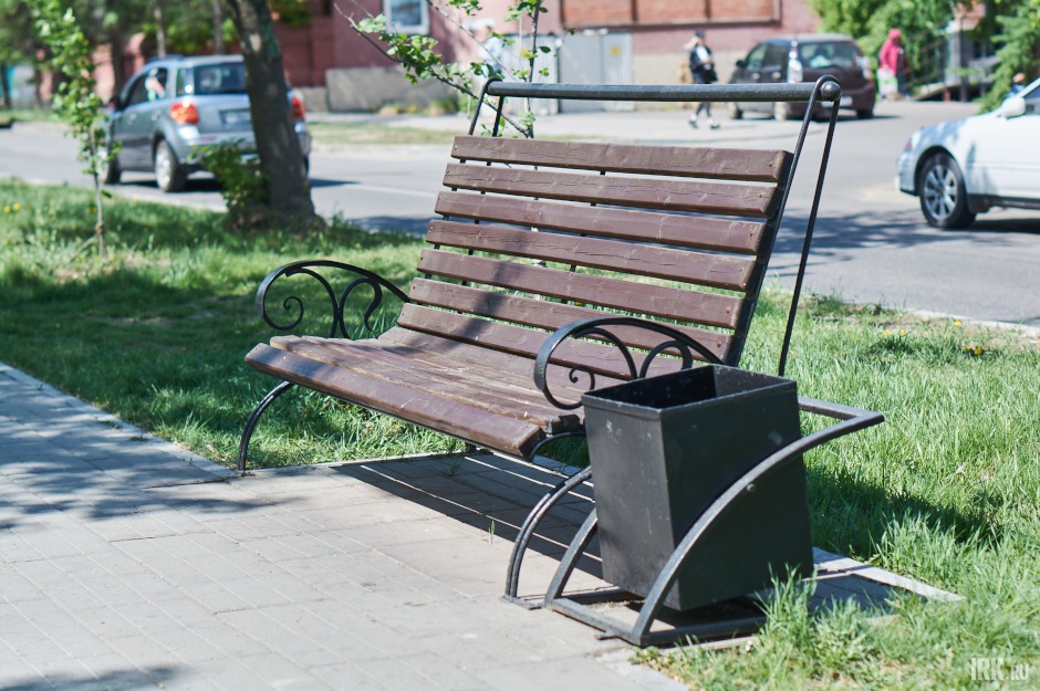 Идем по скверу. Здесь на тротуаре асфальт заменили на плитку, по прошествии трех лет эксплуатации нет ни провалов, ни проседания. На территории сквера поставили скамейки, которые, к слову, не мешало бы уже починить и покрасить, и урны.