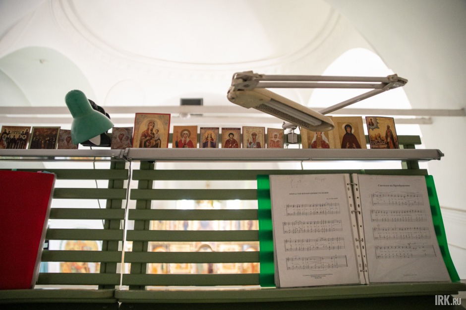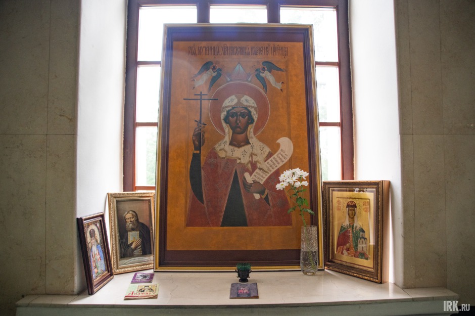Настоятель включил свет в алтаре, и Царские врата как будто начали светиться изнутри. И это неслучайно: в храме алтарь, который располагается в восточной части здания, символизирует образ рая и пришествие Христа. В нем стоит престол (в христианском храме стол, находящийся в середине алтаря, освященный архиереем для совершения на нем Евхаристии. — Прим. ред.), изготовленный из розового оникса, который с двух сторон украшают также вырезанные из камня кресты. Престол в Иркутск привезли из Валаама. Всего было изготовлено два таких престола, второй находится в одном из храмов острова.