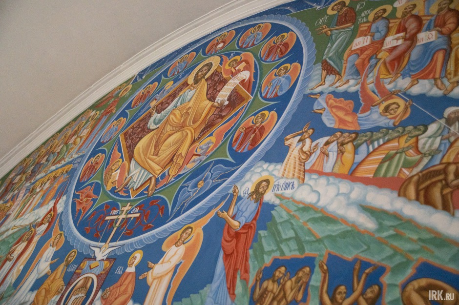 Слева на стене изображены святители Иннокентий Иркутский (в миру Иван Кульчицкий), митрополит Иннокентий (Вениаминов) и Софроний Иерусалимский, которые написал также Михаил Лутаенко. Рядом находится двухметровое распятие Христа, созданное по эскизу того же мастера. Изначально, вспоминает отец Андрей, планировали вырезать по дереву библейский сюжет, не раскрашивать работу – только покрыть ее лаком. Но резчик решил проявить инициативу и покрыл распятие коричневой краской.