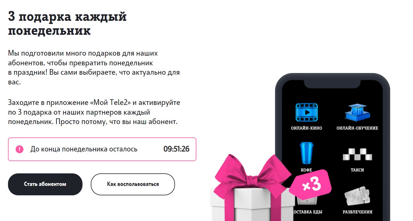 Наверное, есть на свете люди, для которых понедельник – день как день. Такой же, как среда или суббота. Возможно, есть даже те, кто любит начало недели, ведь это «старт», а на старте ты должен быть полон энергии и сил. Как бы там ни было, я отношусь к другой касте людей. К тем, кому бы понедельники «взять и отменить». Но любопытства ради решаюсь на эксперимент: сделать все возможное, чтобы начало моей недели было приятным. А поможет мне в этом мой оператор связи – Tele2. Компания уже в который раз запускает в Иркутске акцию «Понедельники» и дарит своим клиентам подарки, чтобы они могли начать неделю легко. По три подарка каждый первый день недели по 21 ноября включительно! Проверим, как это работает.
