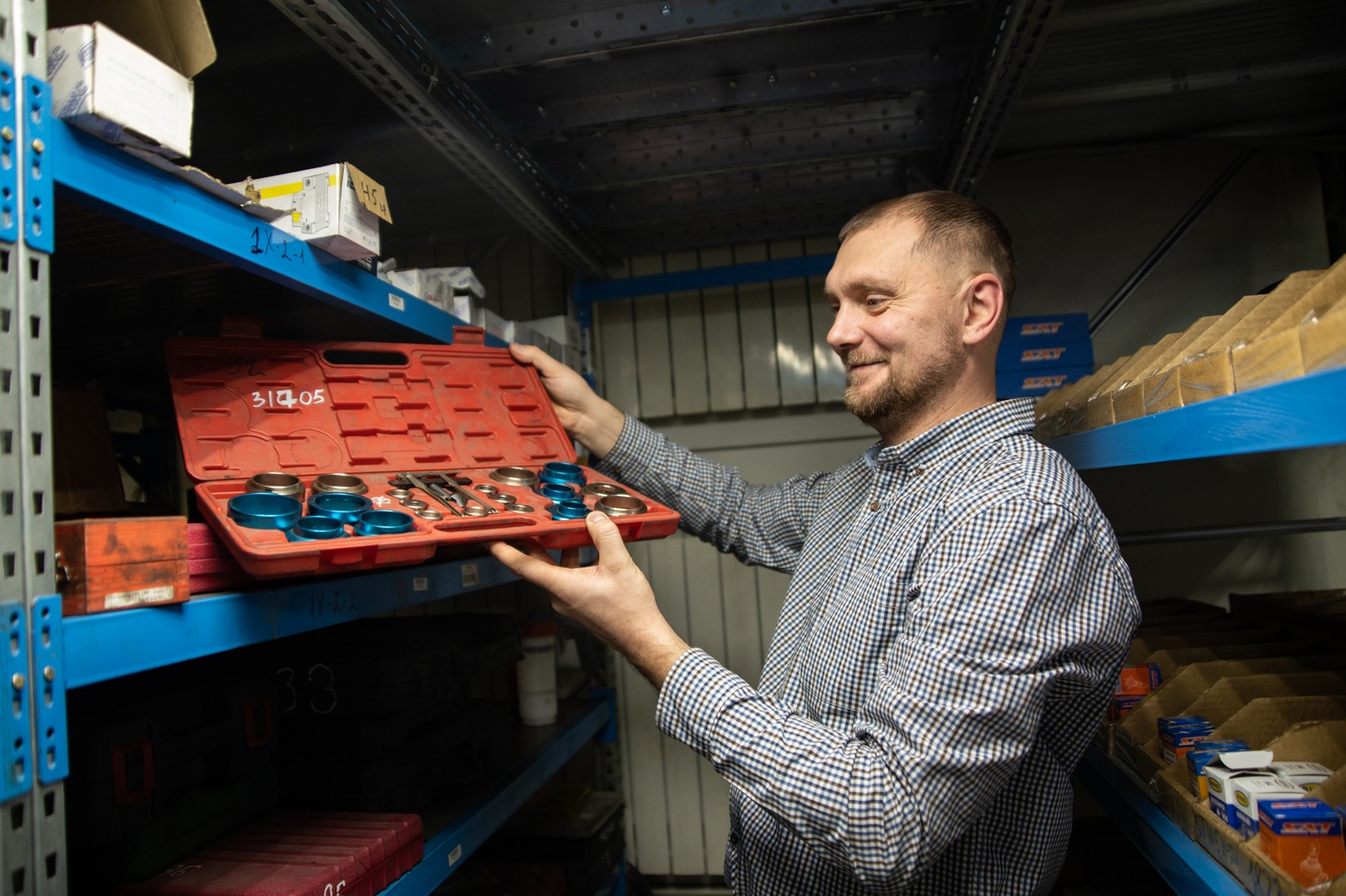 Итак, в двухэтажном складе на Академической хранятся запчасти, необходимые для ремонта в автосервисе: радиаторы, масла, детали подвески (тормозные колодки, диски и так далее), детали двигатели и ходовой части и многое другое. Представлены многие бренды, в том числе оригинальные автозапчасти TOYOTA и LEXUS. Кстати, цены на сегодняшний момент упали. Был пик, когда четырехлитровая канистра масла для Toyota доходила до 14 тысяч рублей, сейчас — около трех-четырех тысяч. Если нужной детали нет в наличии на этом складе, то курьер оперативно доставит ее со склада на Ракитной.