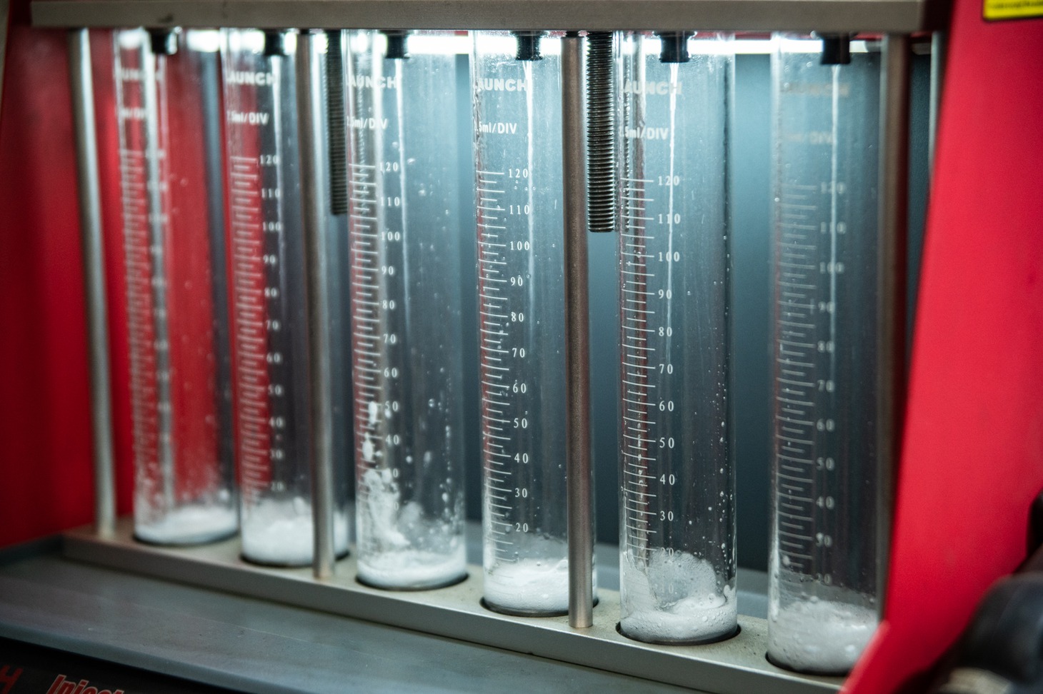 Здесь же стоят стенды по очистке форсунок, для проверки свечей. Механик Александр включает аппарат и демонстрирует их работу. Виталий Прудников при этом отмечает, что на СТО работают только механики с опытом.