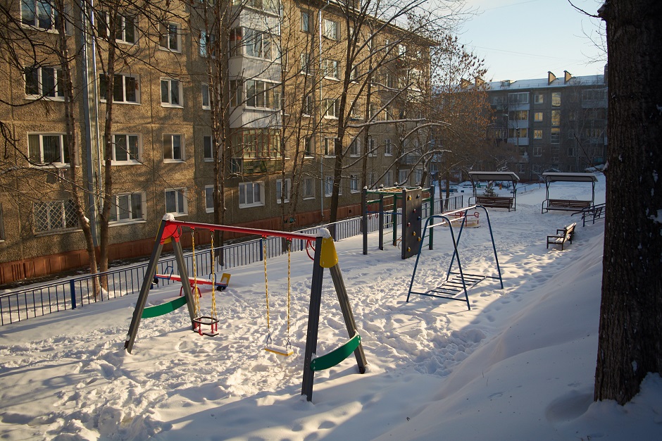 Наша прогулка началась в микрорайоне Юбилейный. Первая точка: внутридворовая территория дома №76. Здесь в 2022 году обустроили игровую площадку с резинополом, качелями и скамейками. Детский городок установлен по просьбам местных жителей, проект полностью согласован с ними. Финансирование осуществлялось из средств депутатского фонда, всего было затрачено около 1 800 000 рублей.