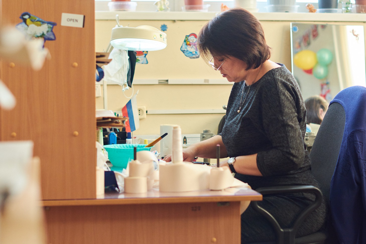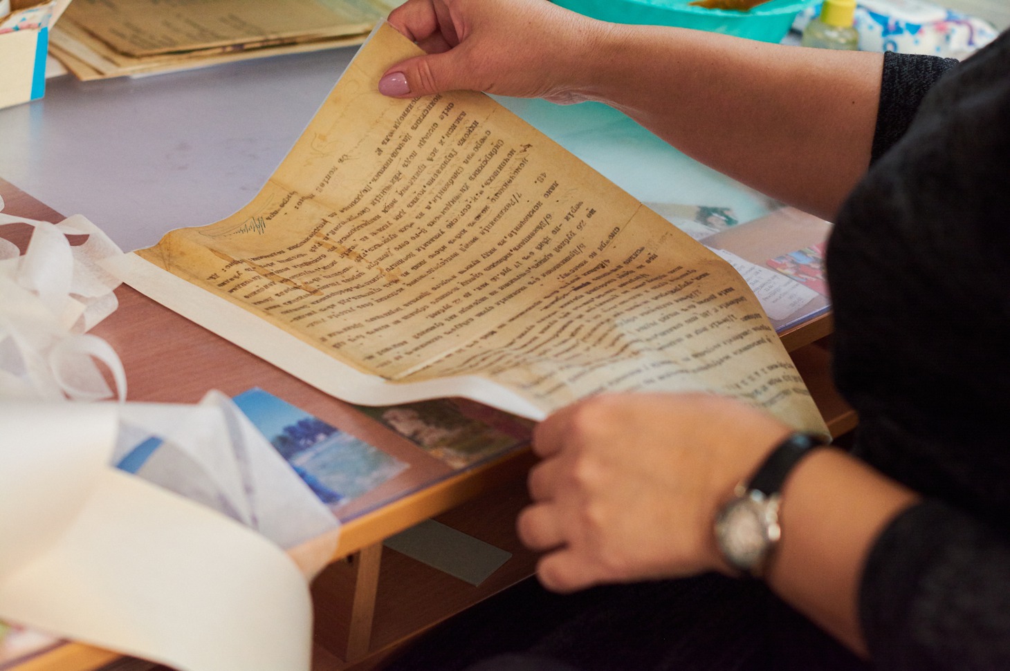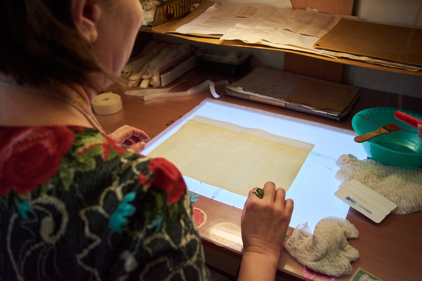 В небольшом помещении работают четыре специалиста. На их столах разложены ножницы, клей, полупрозрачная лента, стоит пресс. Реставраторы «наращивают» корешки, чтобы страницы можно было вшить в дела, заклеивают порванные страницы. Готовые листы кладут под пресс, оставляют на одни-двое суток для разглаживания.