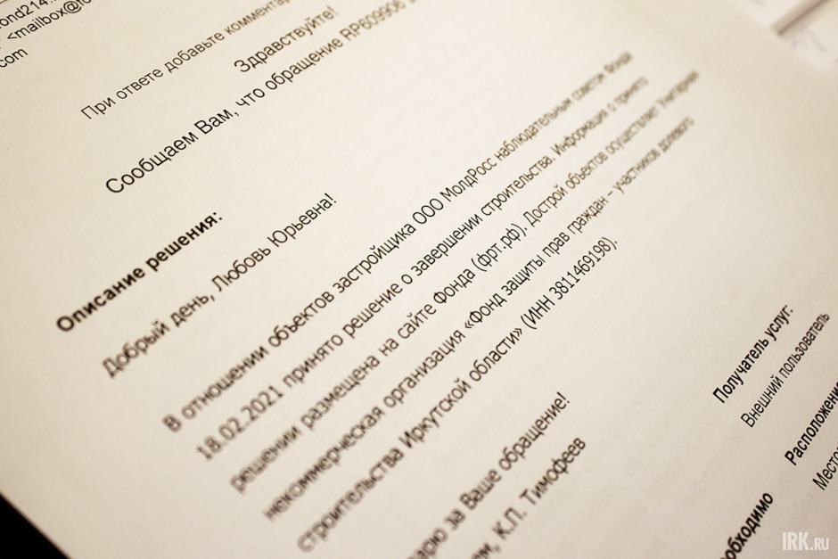 Виктор показывает внушительную стопку документов. В первую очередь он показывает те, которые были размещены на сайте федерального фонда. Среди них — письмо от 13 марта 2021 года на имя Романа Лиходиевского, в котором говорится, что федеральный фонд направляет региональному фонду подписанное соглашение о финансировании мероприятий по завершению строительства объектов ООО «МолдРосс». Через два месяца фонд получил уже все права и обязанности застройщика-банкрота: договор перехода прав зарегистрирован в августе 2021 года, тогда же комитет по градостроительной политике администрации Иркутска выдал разрешение на строительство этого объекта.