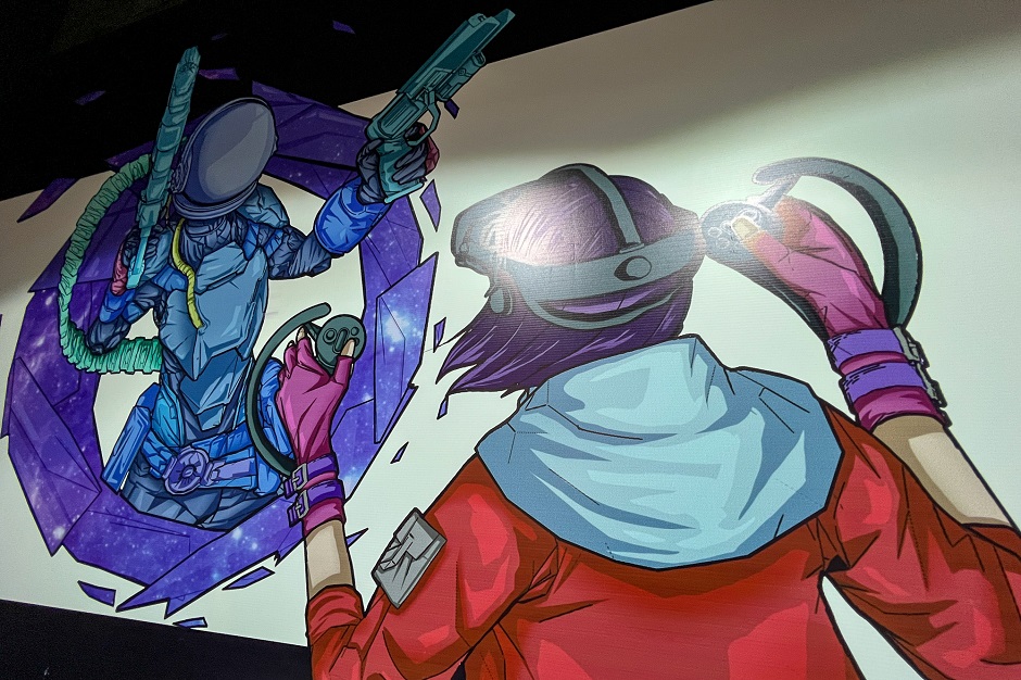 Наш праздник начался с творческой части: мы все вместе рисовали гуашью картину, удобно расположившись в одной из лаунж-зон. Затем часть коллег отправилась в зал Standard-VR, оставшиеся на Арене разделились на две команды. В другой мир погружаешься сразу, как только надеваешь шлем. В игре несколько локаций с укрытиями, можно выбрать внешность и пол персонажа. Один раунд длится десять минут, за это время нужно поразить из оружия как можно большее число участников команды-соперника. На старте каждому выдается два пистолета, более мощное оружие нужно искать на карте: это придает игре дополнительный драйв и требует тщательно продумывать тактику ведения боя.