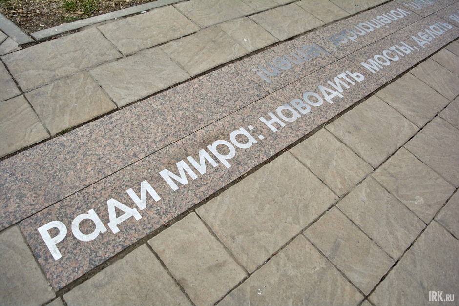 Сразу при входе в сквер есть стенд с информацией о том, что это за место, и краткой справкой об Иркутске и Пфорцхайме: где находятся, численность жителей — на русском и английском языках. На мой взгляд, не хватает пояснений, какое отношение иркутяне имеют к немецкому городку и почему пространство посвящено именно ему; ведь единицы знают, что между Иркутском и Пфорцхаймом подписано соглашение о дружбе и сотрудничестве (я вот, например, не знала). Тут же, на тротуаре выложена надпись на русском и немецком языках: «Ради мира: наводить мосты, делать возможными встречи, учиться друг у друга».