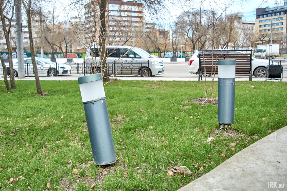 Освещения в сквере достаточно. Здесь установили светодиодные фонари, ландшафтные светильники и сделали точечную подсветку центральной композиции из колонн. В целом они выглядят неплохо, хотя также не соответствуют общей концепции сквера. Вот только несколько светильников повреждены и разбиты, но вандализм — это беда всех наших общественных пространств, которые разрушают сами же отдыхающие.