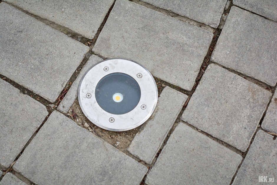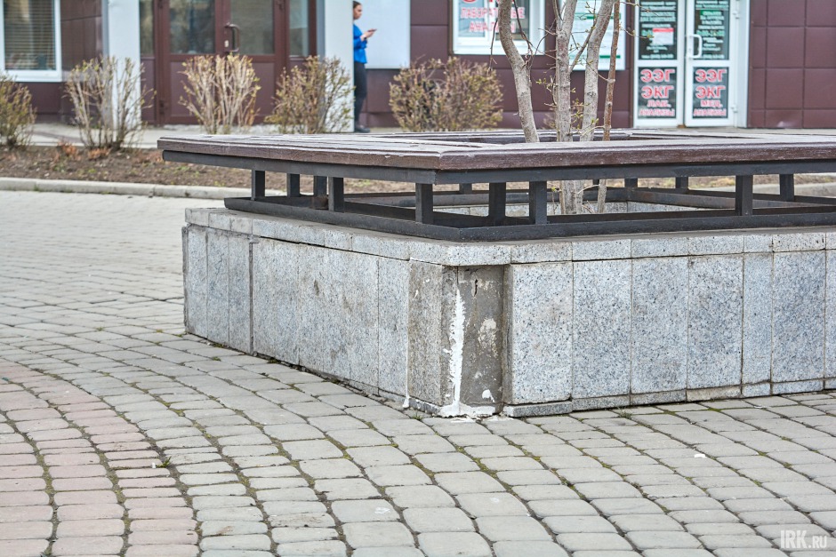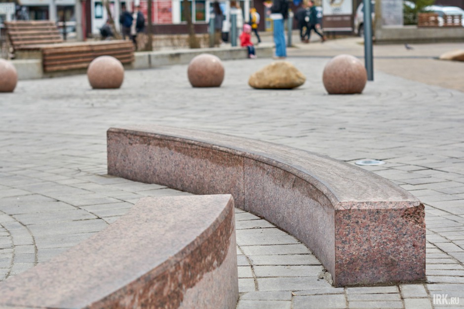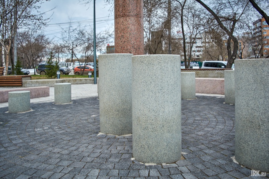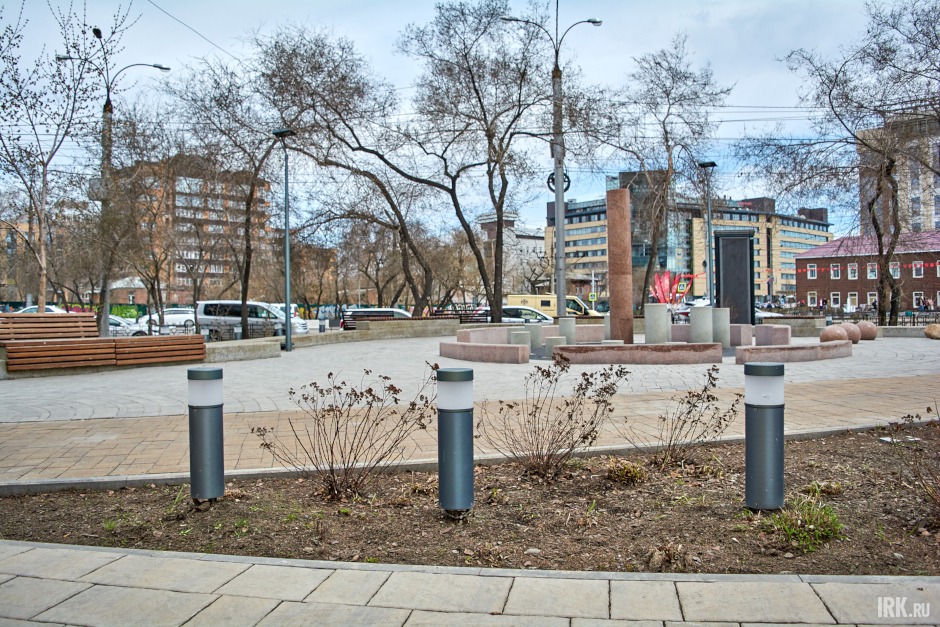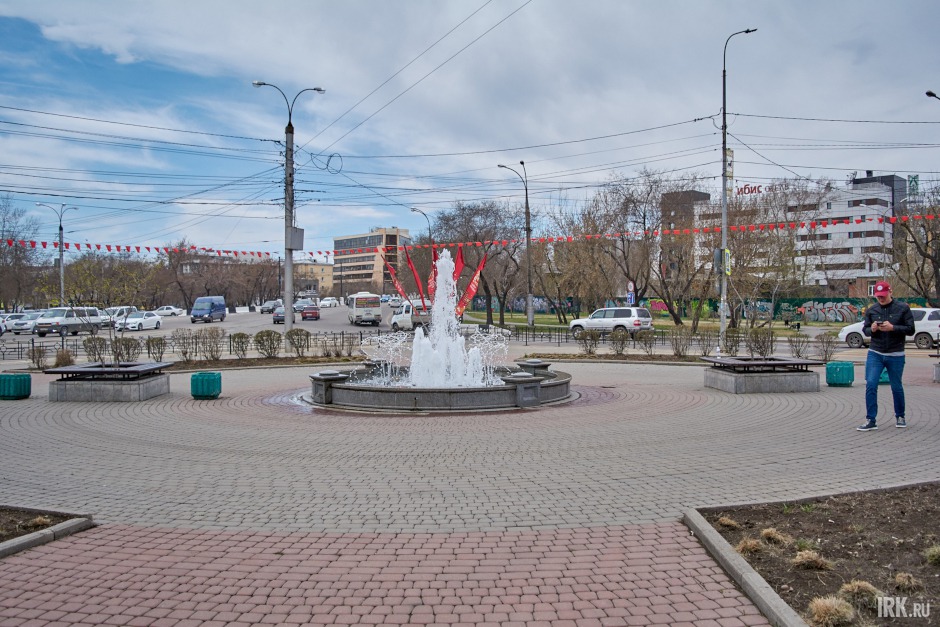 Итак, в центре сквера действительно обустроили небольшой фонтан: в середине находятся несколько одиночных струй воды, бьющих вертикально вверх, а по бокам — три конструкции, которые вращаются по кругу. Справедливости ради отмечу, выглядит он неплохо и нравится иркутянам — особенно вечером, когда включается подсветка. Но его можно было бы сделать и бОльшего размера, тогда бы он стал украшением этого места, а выглядит несколько одиноким. Фонтан сделан на совесть: на граните нет ни сколов, ни трещин.