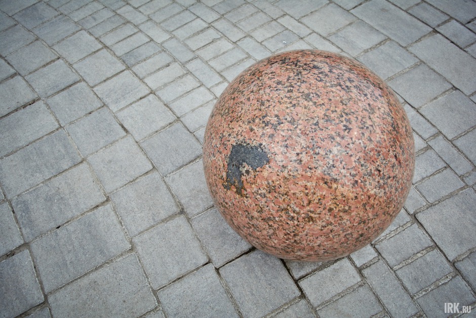 От колонн зигзагом расположили бетонные шары (опять же, по проекту, их должно быть больше), а между ними зачем-то положили большие камни. Один из шаров находится уже не на своем месте, о чем свидетельствует торчащий металлический штырь, к которому он крепился. Остается надеяться, что остальные элементы арт-композиции стоят прочно, так как ребятишки, пришедшие на сквер, прыгают по ним, как по кочкам.