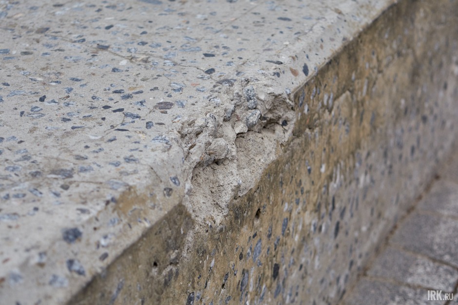 Со стороны улицы Степана Разина построили бетонный парапет, который сейчас весь в трещинах и местами продолжает разрушаться. Видно, что повреждения пытались заделать, но выглядеть от этого он лучше не стал. С этой стороны сквера лавочки установили на парапете. Их деревянные поверхности находятся в ужасном состоянии, с трудом верится, что лавочкам всего два года — а ведь это центр города! Но дело не только в качестве строительных материалов. По словам отдыхающих, скейтеры используют здесь в качестве «трассы» все возвышенности, которые уже не выдерживают нагрузки.