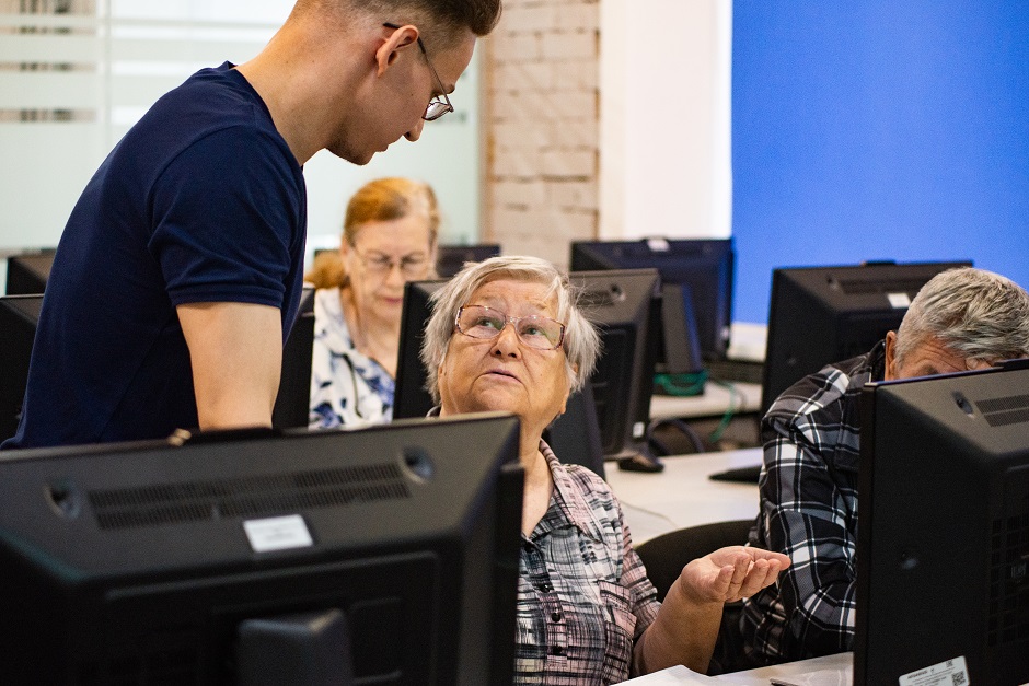 В университетской аудитории — седовласые ученики. Бабушки и дедушки прилежно ведут конспекты, поднимают руку и переспрашивают лектора. «Как будто в школьные годы снова вернулись», — шутят они за партами. Участники поделены на две группы: в одной аудитории осваивают компьютер и интернет, в другой — учатся пользоваться смартфоном.