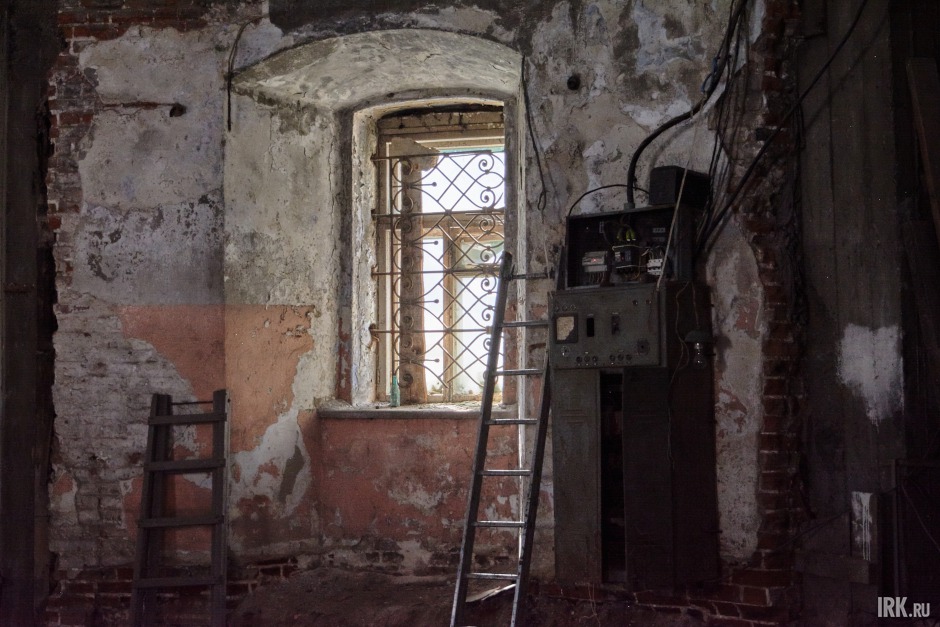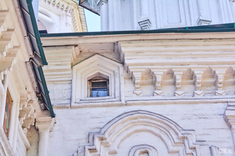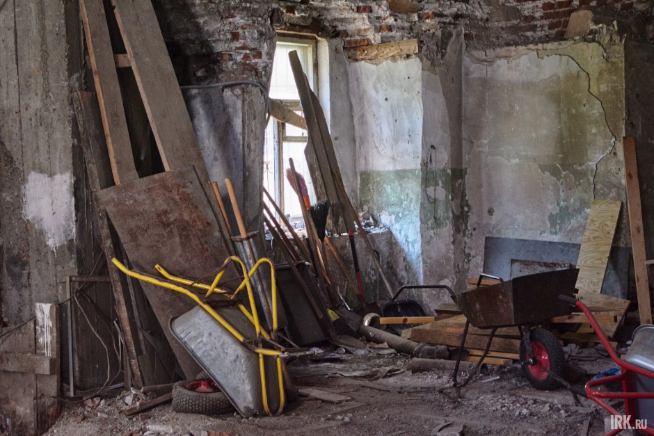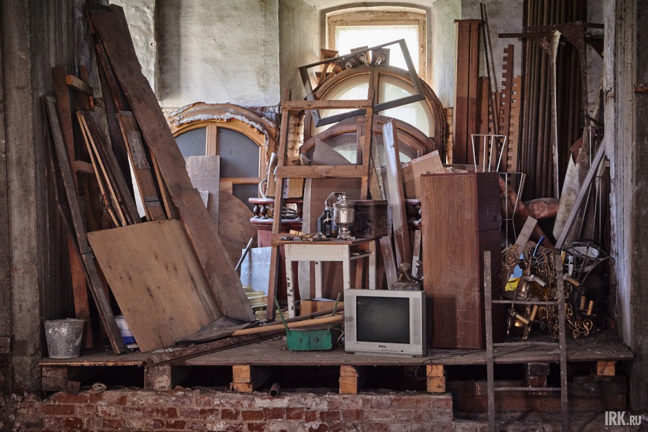 На противоположной стороне храма пылятся вещи, оставленные много лет назад реставраторами — старенький телевизор, самовар, табурет. Стоят оконные рамы, которые когда-то в спешке установили в Троицкой церкви и также быстро демонтировали, так как выбивались из единого архитектурного ансамбля.