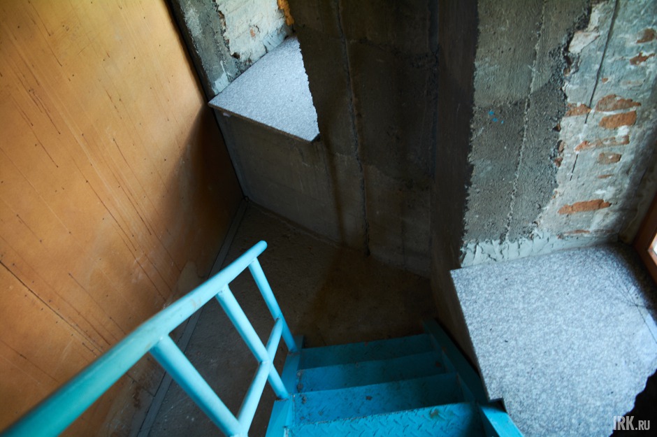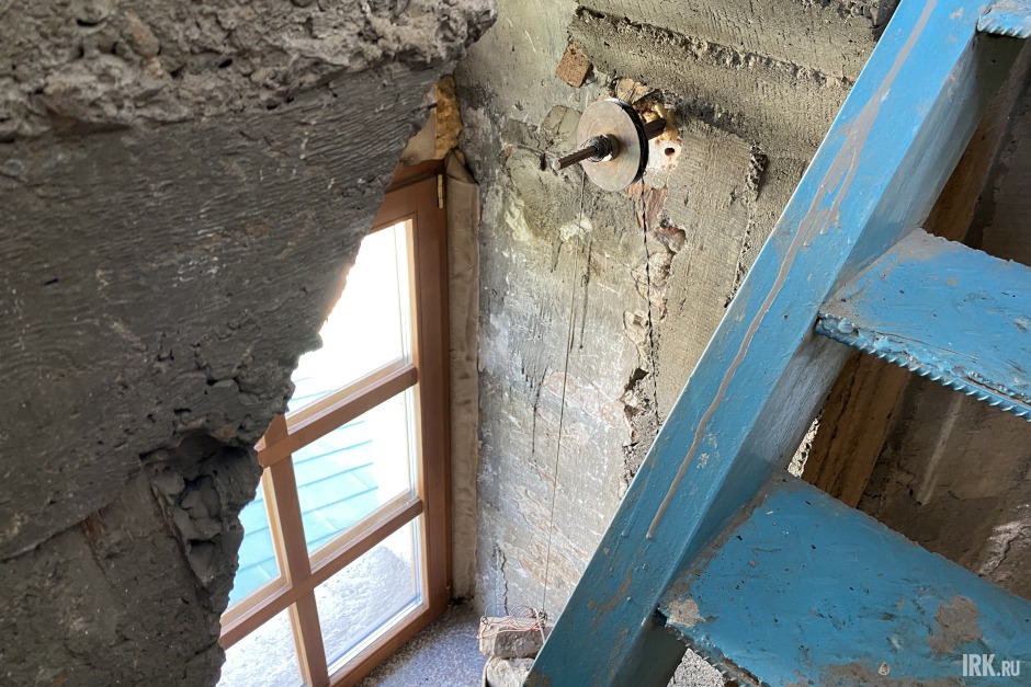 Во время ремонта колокольни лестницу закрыли дверью, которая поднималась и опускалась благодаря самодельному подъемнику из ведра с камнями и веревки.