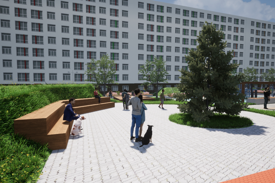 Вместо стандартной детской площадки здесь реализовано несколько игровых зон для жильцов разного возраста: для малышей — с улучшенным травмобезопасным покрытием, для подростков — своя, а для пожилых жильцов — приватная парковая зона вдали от шумных детских площадок; и обязательно — зона воркаута для любителей фитнеса на свежем воздухе. А для прогулок обустроят две небольшие парковые аллеи с удобными вымощенными дорожками. Выделена и площадка для выгула собак.
