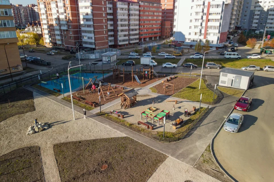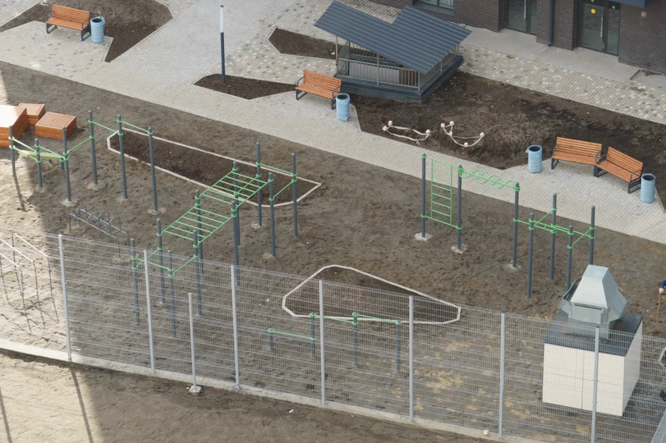 Внутридворовое пространство включает в себя несколько функций: игровую, прогулочную и для занятия спортом. Здесь есть современные детские площадки и места для отдыха родителей. Для любителей спорта на свежем воздухе организована многофункциональная воркаут‐зона с турниками и беговыми дорожками. При проектировании дворов особое внимание уделили озеленению, чтобы жители чувствовали себя максимально уютно.