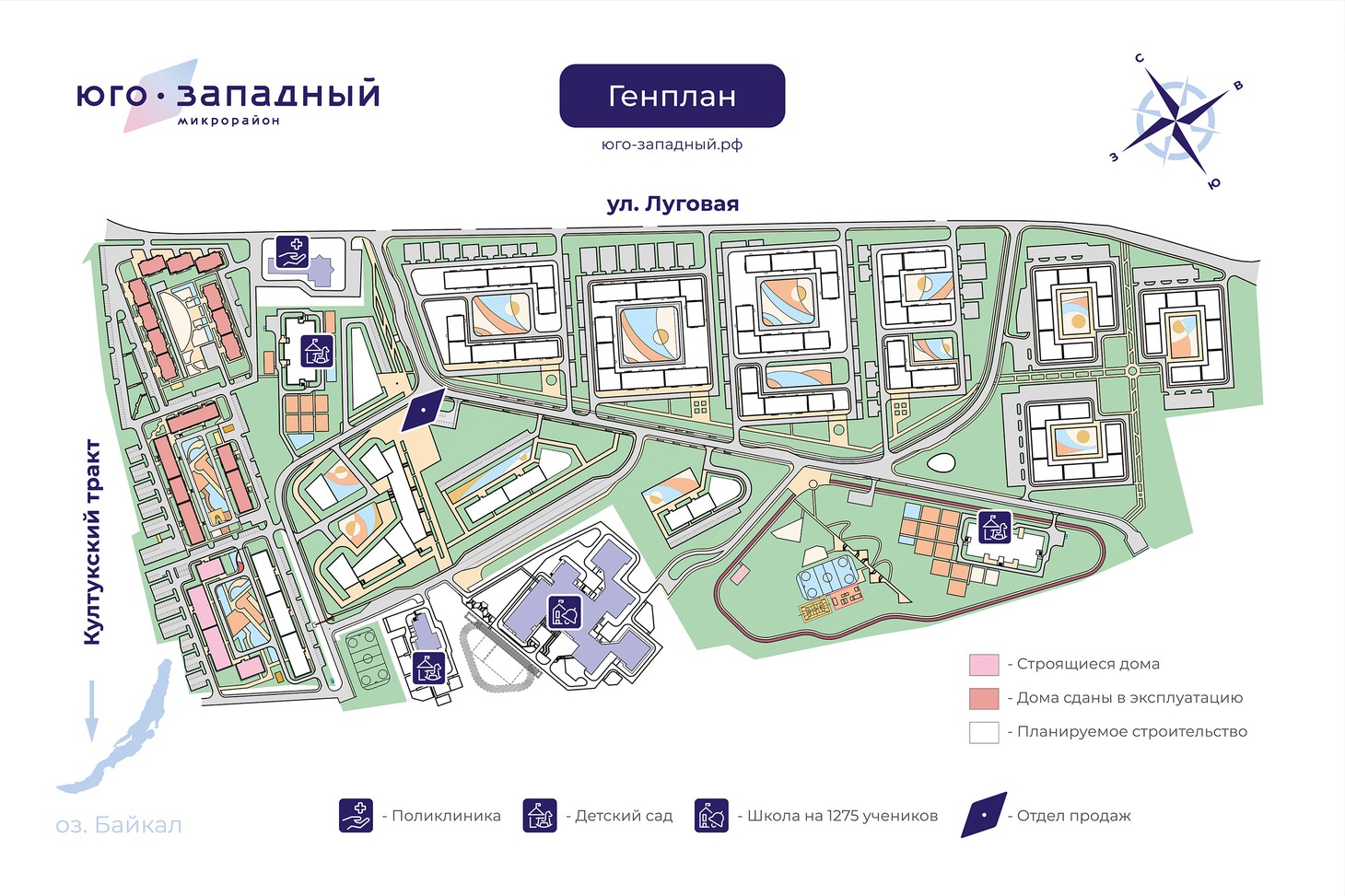 «Юго-Западный» – это новый для Иркутска формат жилья. Проект разрабатывался, опираясь на зарубежный опыт, когда сначала прорабатывается инфраструктура микрорайона, а потом возводятся дома. Так и здесь: в самом центре «Юго-Западного» есть все необходимое для комфортной жизни — школа на 1275 мест, детский сад на 220 мест, поликлиника, магазины. Проектом предусмотрено строительство еще двух детских садов на 240 и 350 мест. Кроме этого, сейчас идет активная работа над благоустройством собственного парка. В планируемых очередях также появится большая пешеходная улица с магазинами и кафе. Концепция — на стадии разработки.